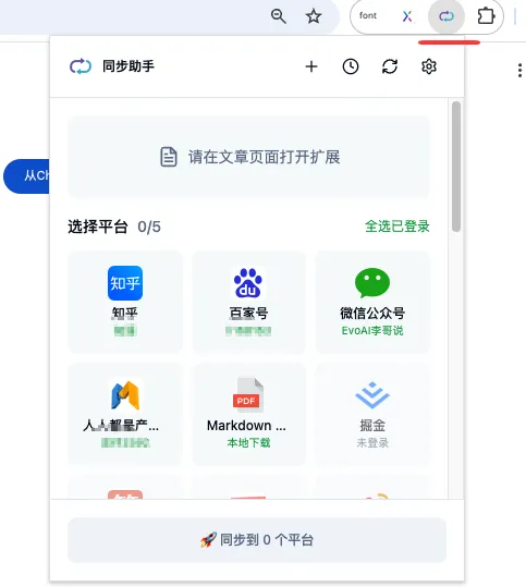 在浏览器中正常登录你要同步的平台账号(如知乎、掘金、头条、小红书等)。