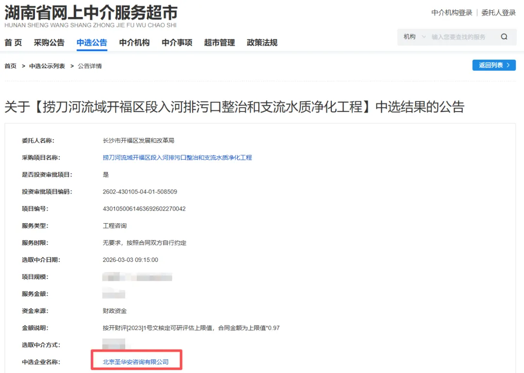 通过专家评审,确定北京圣华安咨询有限公司(简称“圣华安”)中标“捞刀河流域开福区段入河排污口整治和支流水质净化工程”项目。