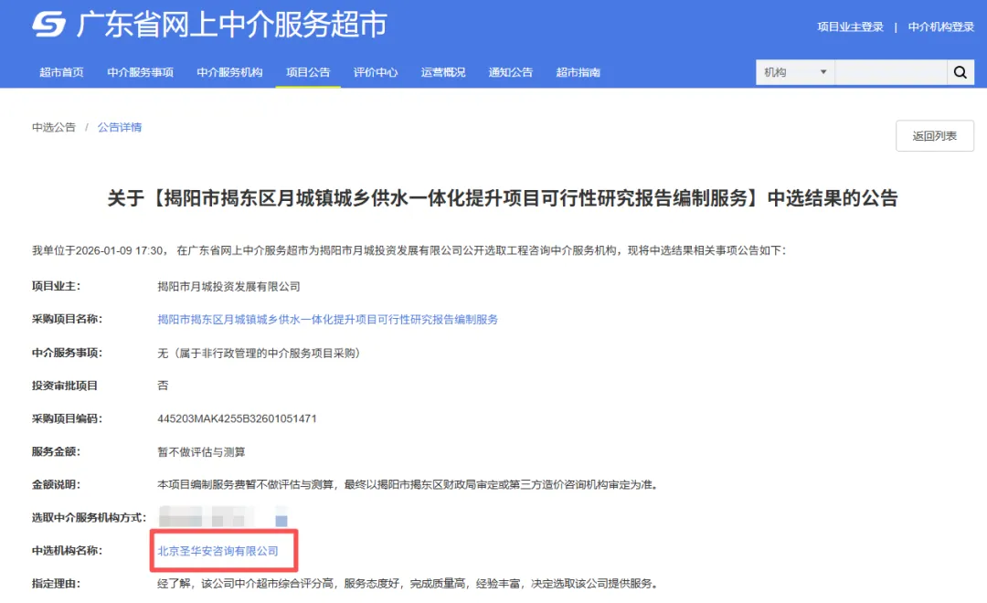 通过专家评审,确定北京圣华安咨询有限公司(简称“圣华安”)中标“揭阳市揭东区月城镇城乡供水一体化提升项目可行性研究报告编制服务”项目。
