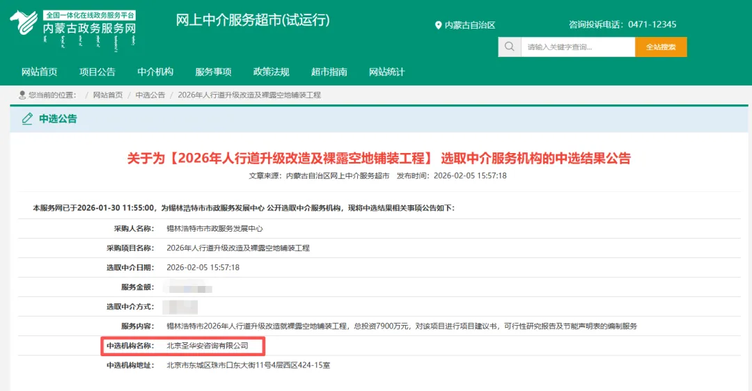 锡林浩特市市政服务发展中心通过内蒙古政府服务网于2026年2月就“2026年人行道升级改造及裸露空地铺装工程”项目,进行公开招标遴选。