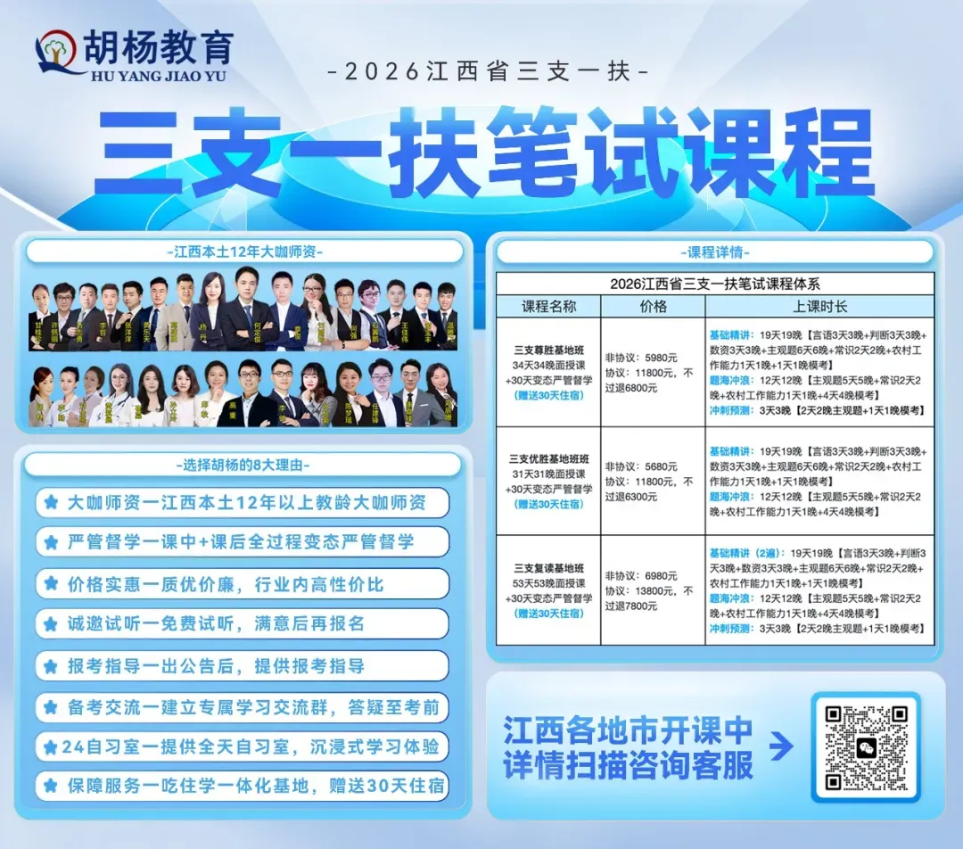 2026江西三支一扶3月19号开课①江西本土12年一线师资全程授课②课中课后严管督学:不得迟到、旷课,手机上交,当天知识点抽背等③吃住学一站式公考基地培训班,学习住宿环境好④24小时沉浸式学习室⑤赠送课程内 4 人间住宿⑥行业内价格实惠⑦随时可以试听比较