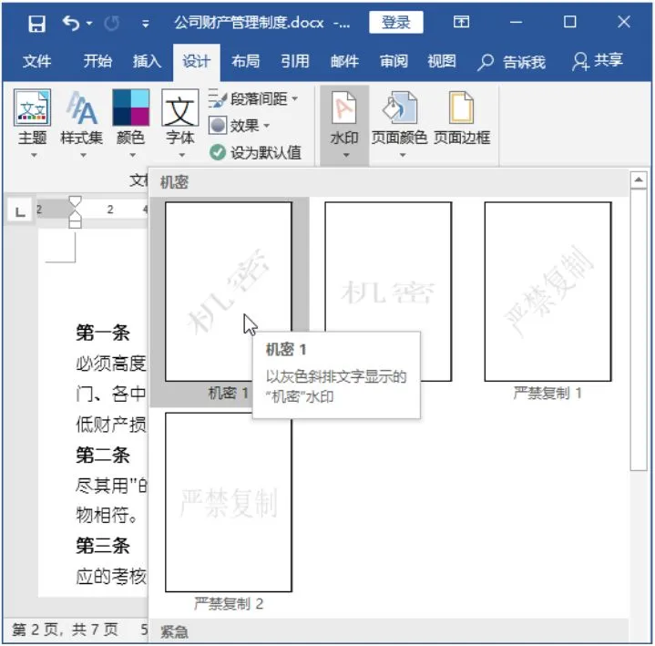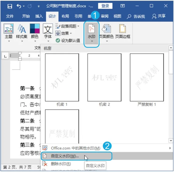 Step01 选择菜单命令。在“公司财产管理制度.docx”文档中单击【设计】选项卡【页面背景】组中的【水印】按钮;在弹出的下拉列表中选择【自定义水印】选项。