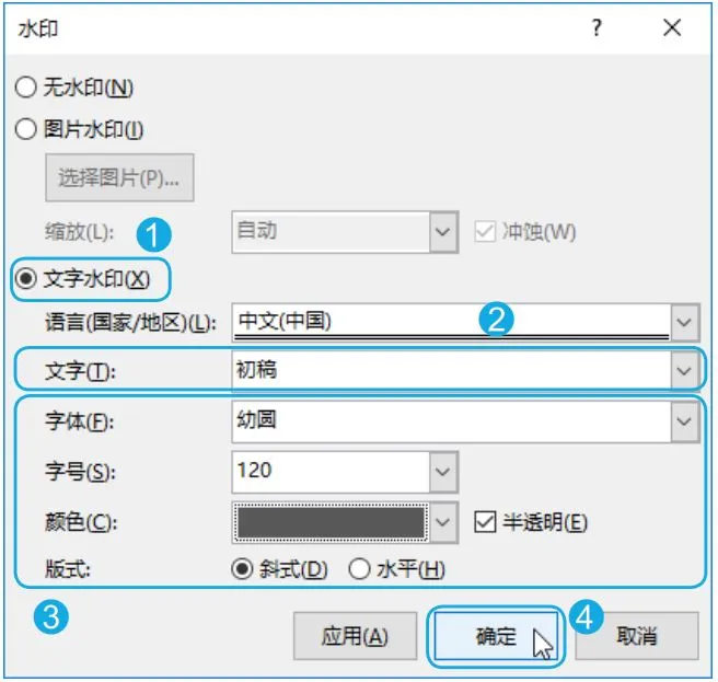 Step02 自定义文本水印。打开【水印】对话框,选中【文字水印】单选按钮;在【文字】文本框中输入水印内容;根据操作需要对文字水印设置字体、字号等参数;完成设置后,单击【确定】按钮。