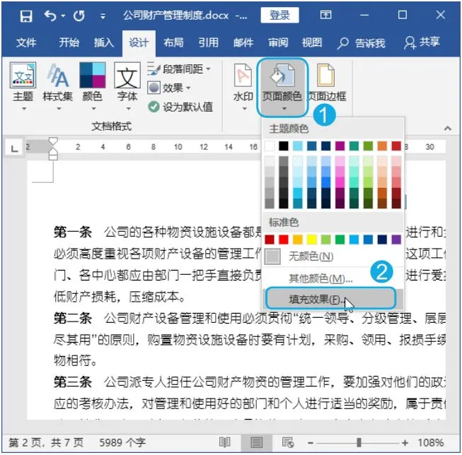 Step01 选择页面颜色命令。在“公司财产管理制度.docx”文档中单击【设计】选项卡【页面背景】组中的【页面颜色】按钮;在弹出的下拉列表中选择【填充效果】选项。