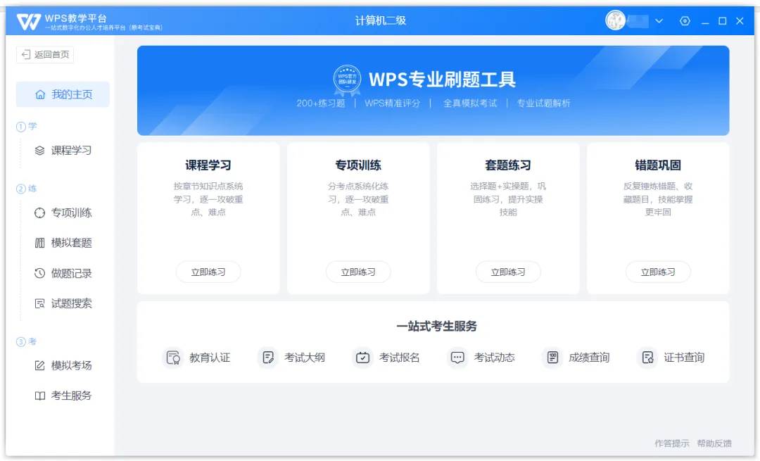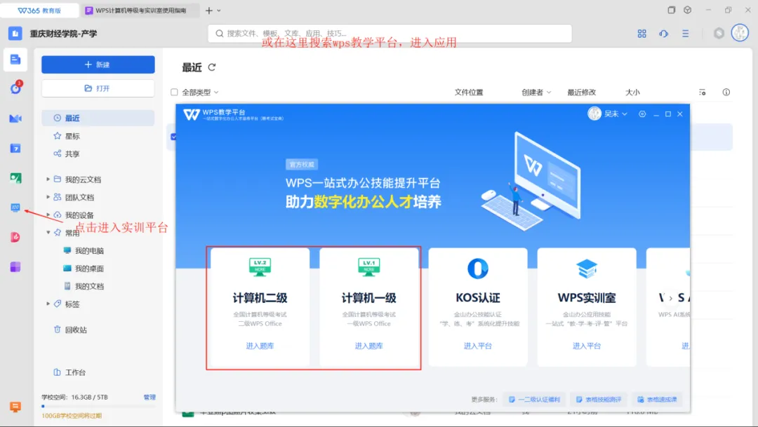 (5)进入实训室:登录后按以下路径操作:WPS 教育版首页→左侧边栏【WPS 教学平台】(100 分图标)/ 搜索栏搜索【WPS 教学平台】应用→点击【计算机一级】或【计算机二级】卡片,即可进入对应实训室。