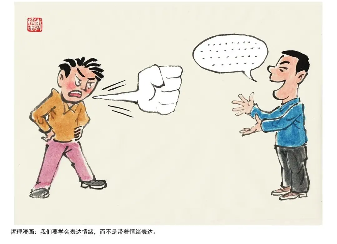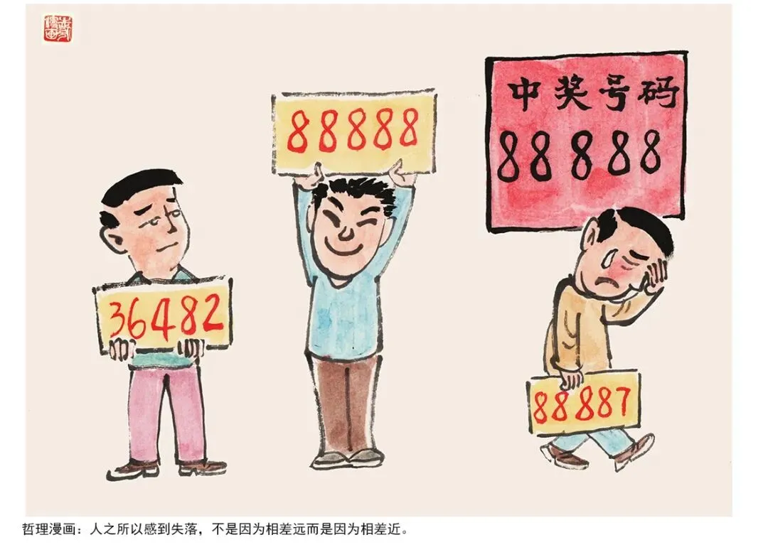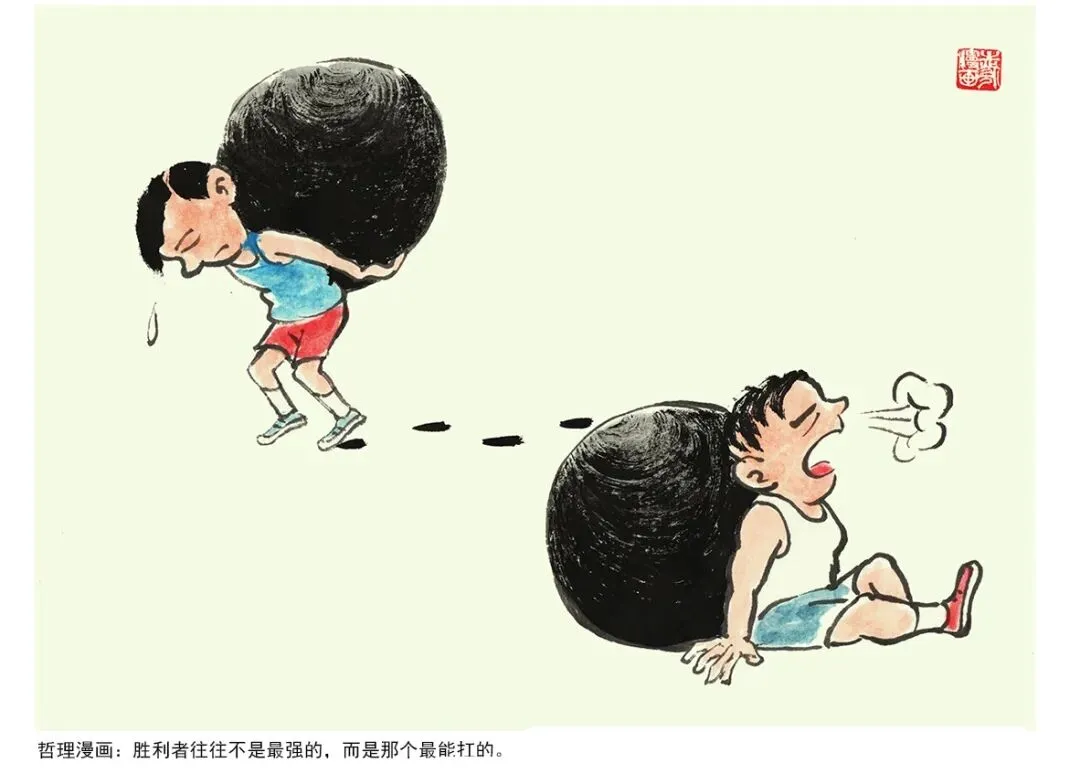 水墨是载体,往大了说是沾点国画的佛光,往实了说是为了离开会绘画屏保护眼睛;漫画是灵魂,创作过程中离不开夸张的造型和情节,用线条和色彩来描绘;哲理是内容,以文字呈现,有些是直接拿来名人名言,不用担心被人告发侵权,有些是借鉴文艺作品中的精彩词句进行改编,有些是自己对生活感悟的一些总结。