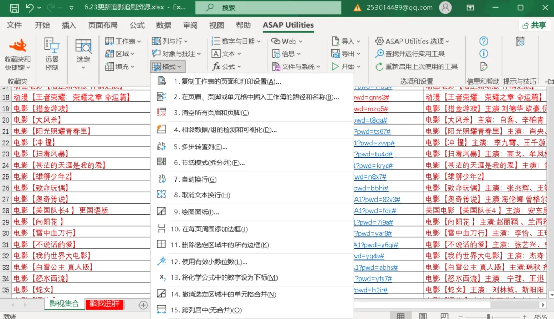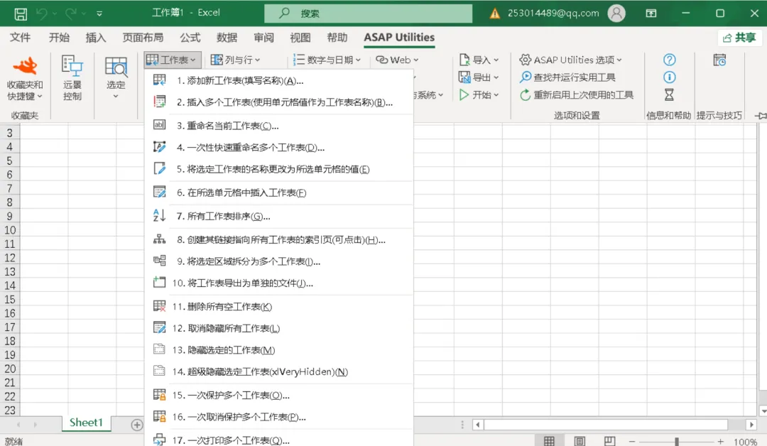 安装好ASAP Utilities后,你的Excel菜单栏里就会多出一个专属选项卡。里面密密麻麻的功能,都是你的效率神器。这里先挑几个最实用的给大家尝尝鲜: