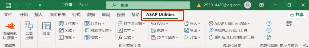 大功告成:安装完成后,重新打开Excel,你就会在菜单栏看到闪闪发光的 “ASAP Utilities”,尽情享受开挂般的体验吧!