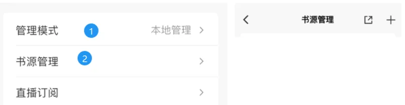把管理模式换到“本地管理”,打开“书源管理”,找到里面的“➕”,进去里面可以导入书籍、漫画和影视的外部源。