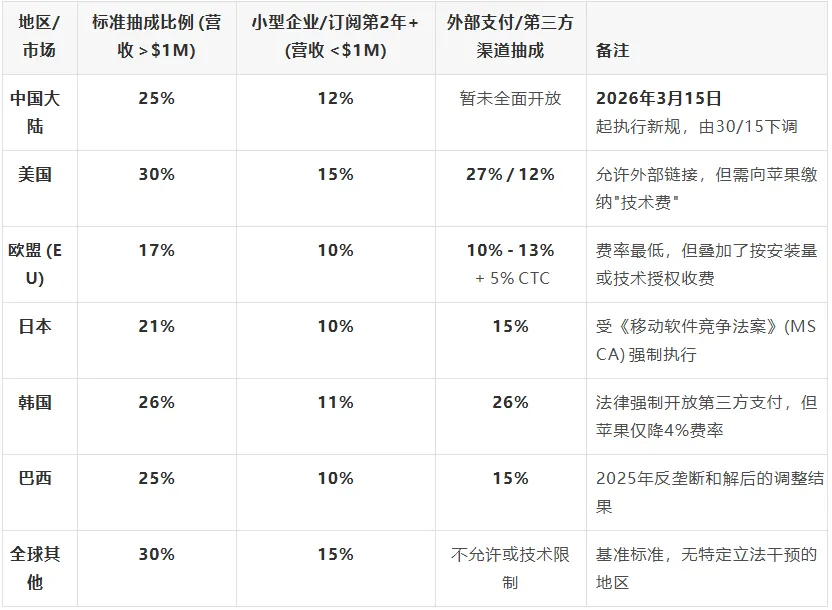 往外看别的市场,欧盟那边写着17,还叠一个5的核心技术授权费,体量大的应用算下来压力还在,美国基础抽成还是30,外链支付给开了口子,技术费27照样计,日本给到21,韩国是26,巴西现在也是25,来源是2025年的反垄断和解,路径不一样,通知里又有一句话,国区费率不高于其他市场,谁再降,国区这边跟着看齐,节奏就摆在这儿。