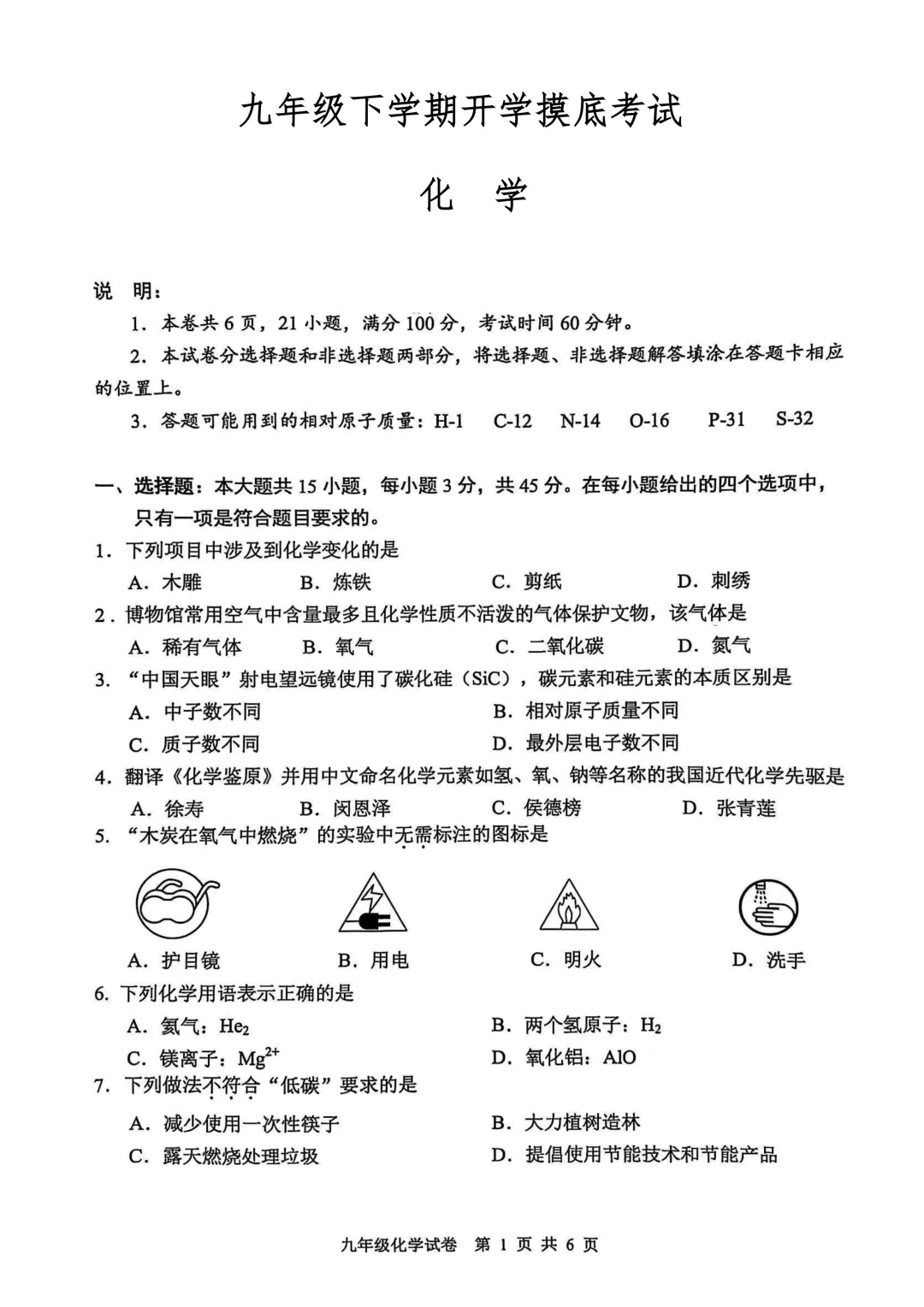 化学人教版九年级下学期开学摸底考(可下载)