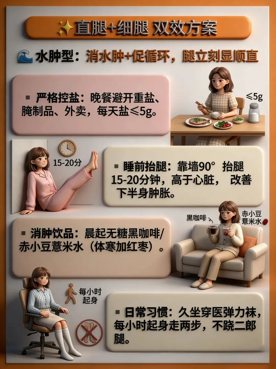 水肿型🥵:早细晚粗,按压留凹陷,久坐久站腿胀