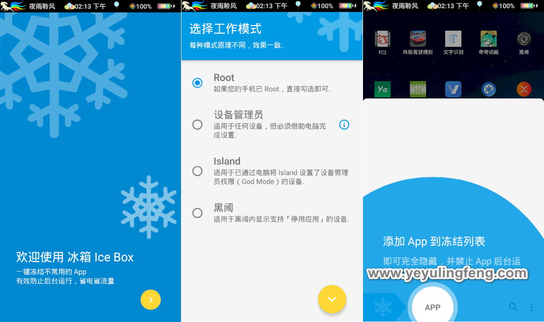 安卓系统一直被诟病的就是各种肆意妄为的应用进程占用着影响手机性能,手机在日常使用中随着功能的需求慢慢的都会装上各种丰富的软件工具,有些工具日常使用频率不怎么高但尚未达到卸载的地步,再加上个别不安分的应用进程总是默默后台运行着是不是弹个消息推送非常令人蛋疼。那么有没有一款能够将不常用的应用暂时封禁起来待下一次使用再恢复的方法没?只要思想不滑坡,办法总比问题多,冰箱 Ice Box就是这样一款工具,就跟他的命名一样,将暂时不用的食材放入冰箱隔绝外界因素进行冻结,待下次食用的时候取出还能保持新鲜,原理基本类似,可以有效的防止它们在后台偷电偷流量。
