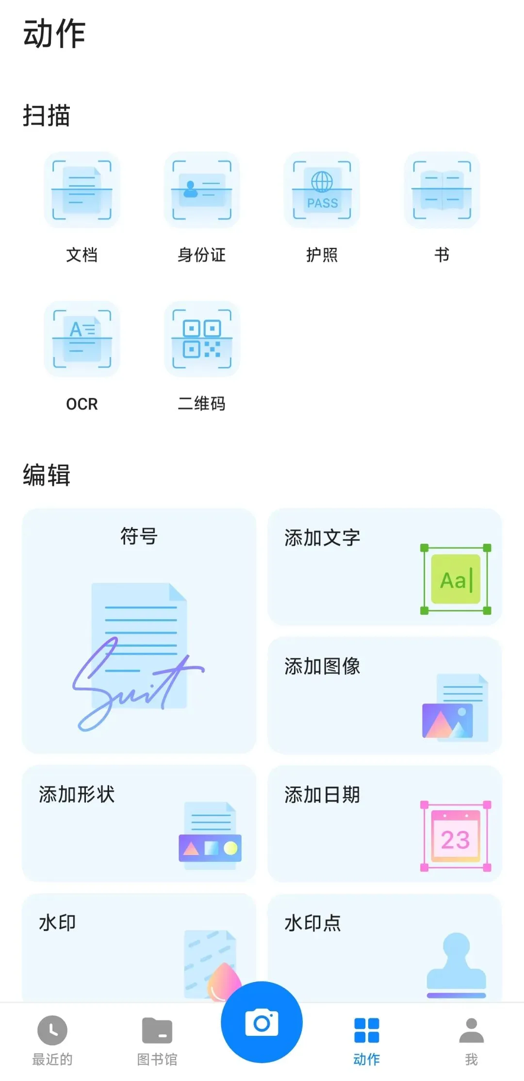 软件主要功能就是扫描,包括文档扫描、身份证扫描、OCR识别等,而且支持图片编辑添加文字、水印、日期等。