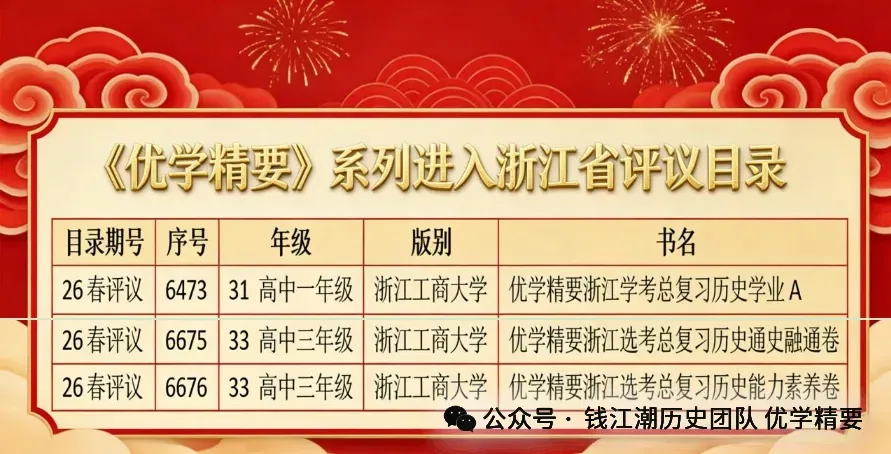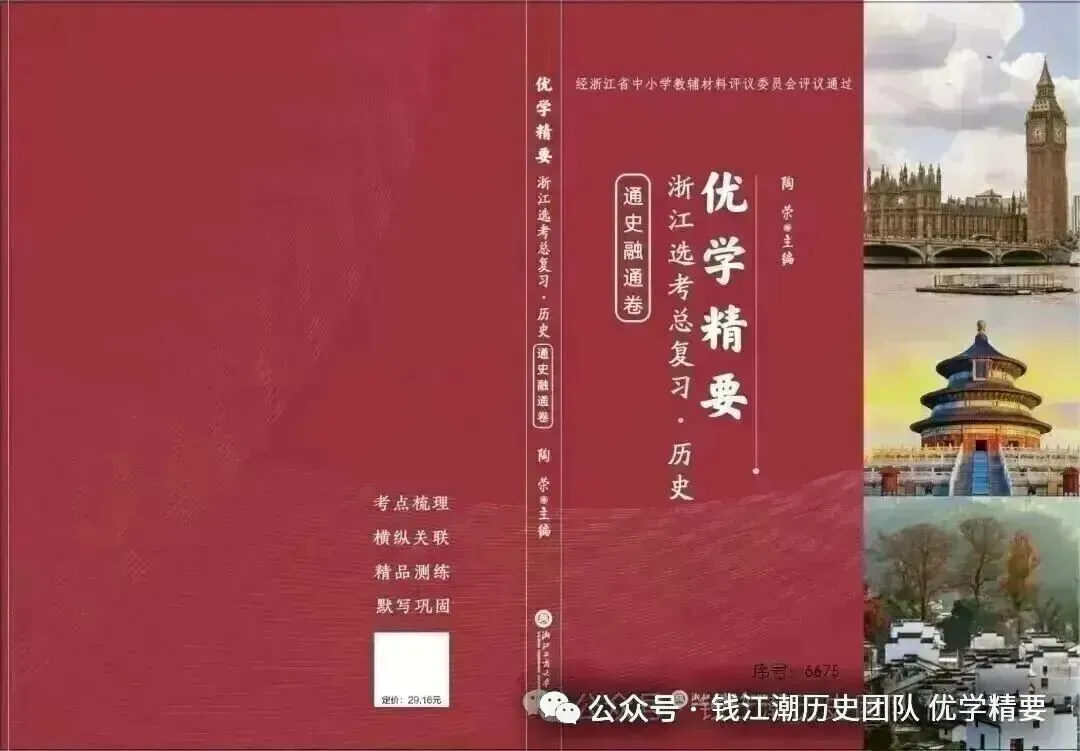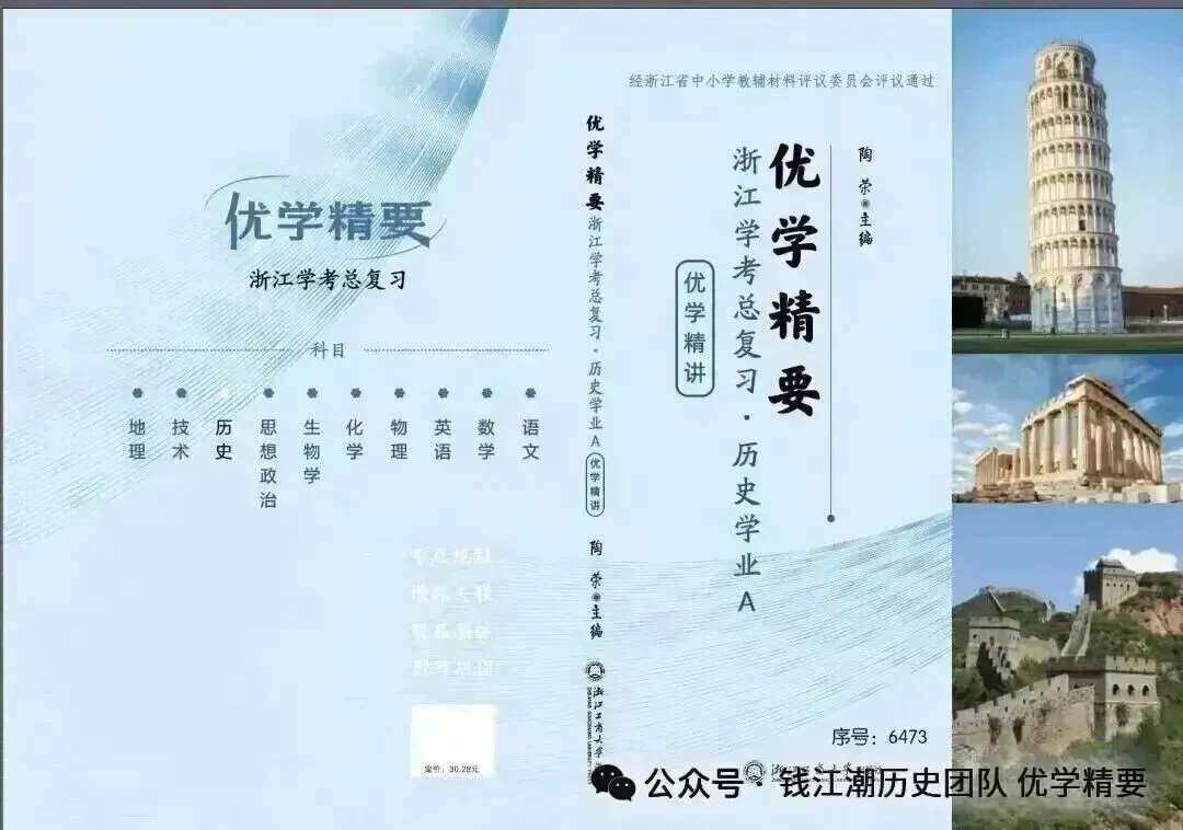 陶荣老师主导的钱江潮历史团队深耕教材研究、参与全国各地高考模拟卷命制多年。团队开发的《优学精要》系列图书以服务浙江广大高中历史教师的教学工作为宗旨,该系列的学考复习和选考复习资料已进入浙江省教辅评议目录,可通过各地新华书店征订,其余图书有望在2026年上半年全部进入评议目录,成为囊括纲要上、纲要下、选必1、选必2、选必3、学考复习和选考复习的全系列图书。