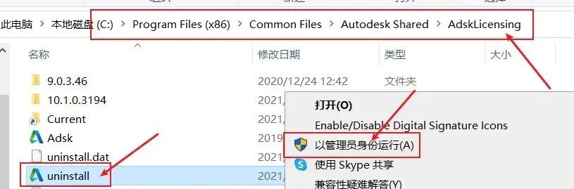 13.在以下路径找到uninstall,管理员身份运行该程序,卸载软件安装的许可证;