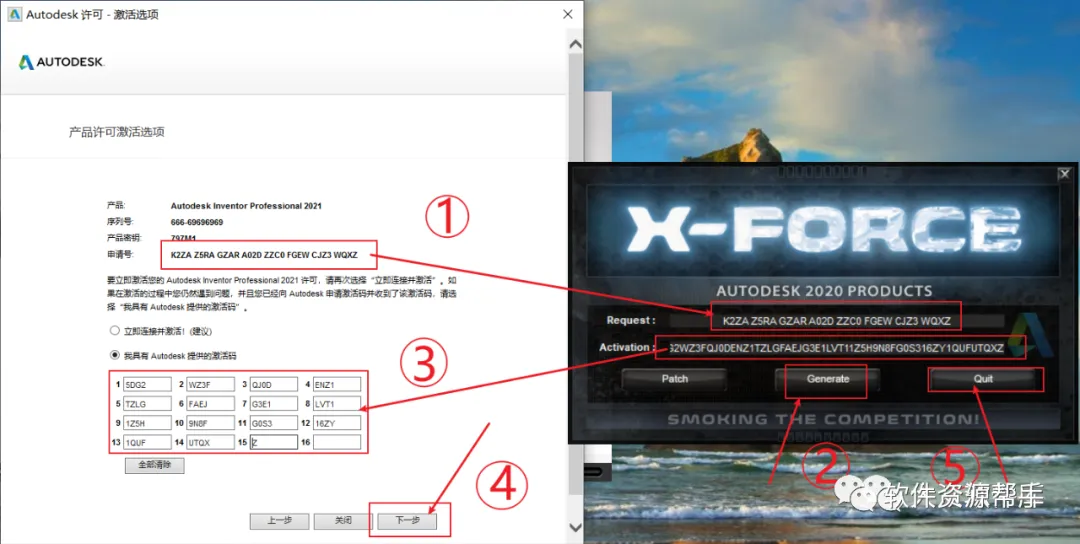 30.先将软件上面的申请号复制(ctrl+c),然后粘贴(ctrl+v)到注册机的第一栏,然后点击Generate,然后再将注册机生成的激活码复制粘贴到软件许可界面(不要粘漏了),然后点击下一步,关闭注册机;