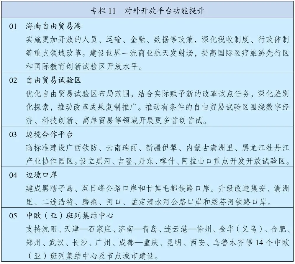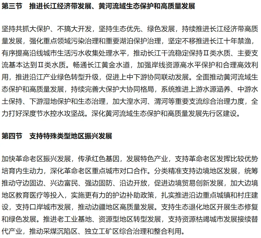 聚焦大保护、大开放、高质量发展扎实推动西部大开发形成新格局,立足功能定位、资源禀赋和产业基础,做强做大特色优势产业,实施一批生态屏障建设重大工程,以开放通道、枢纽节点、平台载体建设促进对内对外开放。立足维护国家国防、粮食、生态、能源、产业安全推动东北全面振兴取得新突破,完善能源通道和交通网络,持续巩固提高粮食综合生产能力,推动科教、农业、生态等资源优势转化为发展成效,加快推进向北开放。开创中部地区加快崛起新局面,强化粮食和能源原材料保障能力,做优做强现代装备制造及高技术产业,建设综合交通运输枢纽体系,推进内陆地区高水平开放。鼓励东部地区加快推进现代化,加强原创性、颠覆性科技创新,引领建设具有国际竞争力的先进制造业集群和现代服务业高地。