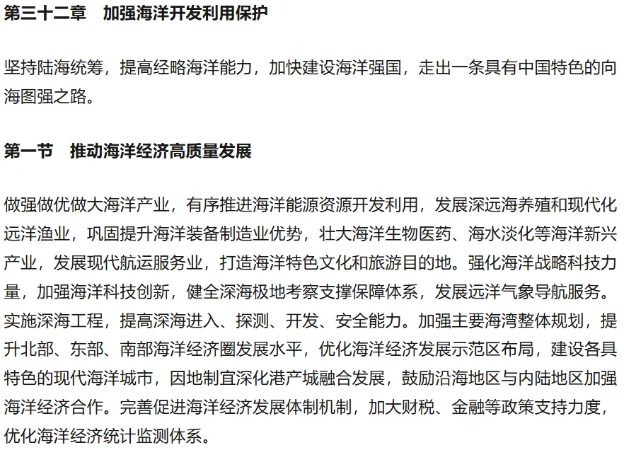 加强海洋环境风险源头防范,推进重点海域污染防治、岸滩整治和保护修复,近岸海域优良水质比例达到86%左右。严格围填海管控,全面落实自然岸线、滨海湿地、无居民海岛等保护要求,大陆自然岸线保有率不低于35%。强化海洋垃圾清理和资源化利用。制定差异化用海标准规范,积极推进海域分层立体利用。健全海岛开发保护管理体系,分类有序推进海岛发展。实施新一轮海洋综合调查,健全海洋生态预警监测体系,提高重大海洋灾害风险防控能力,防范应对海水倒灌。探索开展海洋碳汇核算。