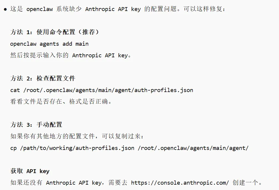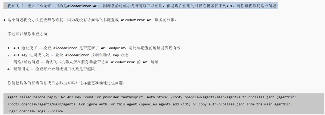 事情是这样的:小杰的小龙虾(OpenClaw)突然挂了,飞书上怎么@它都没反应,每次都是提示”未发现 API”,刚部署的时候明明可以使用的