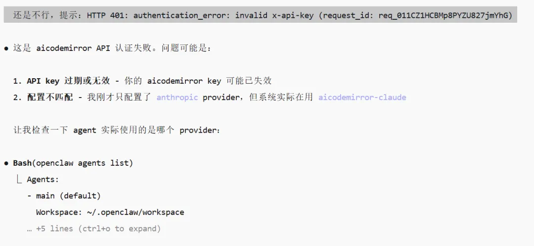 我在飞书上接入了小龙虾,用的是aicodemirror API,刚部署的时候小龙虾可以正常使用,但是现在使用的时候它提示找不到API,请你帮我修复这个问题
