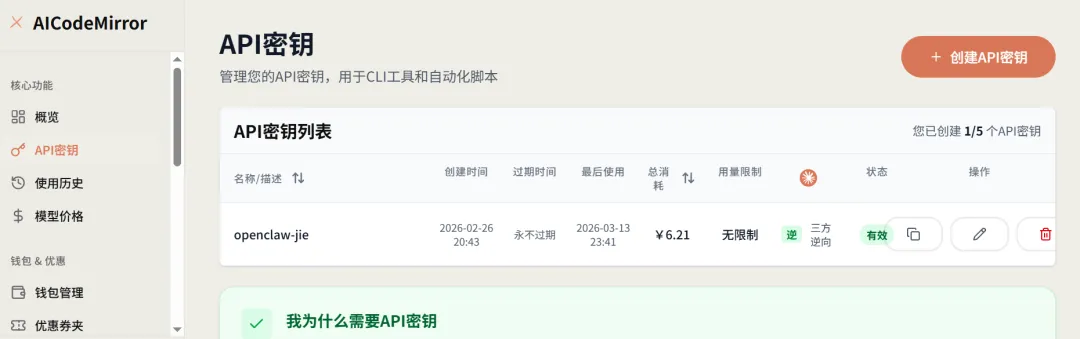注册、充值,然后选择API秘钥,新建一个 秘钥,注意选”官方订阅”渠道,不能用之前 OpenClaw 的那个 key。