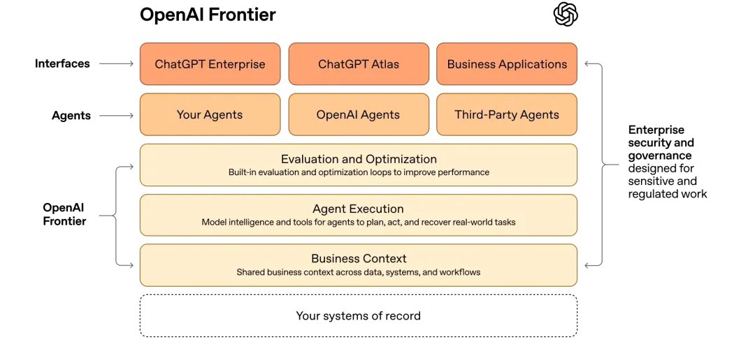 美国当地时间2月,OpenAI正式推出面向企业的新平台 Frontier。从发布的功能来看,这并不是又一个普通聊天工具,而是一个让企业去 构建、部署、管理 AI Agent 的平台。OpenAI给它的定位很直接:帮助企业把原来“只会对话”的AI,推进到真正能干活、能接权限、能接系统、能跨部门协同的阶段。官方介绍里,Frontier强调 shared context(共享上下文)、权限边界、反馈学习和开放标准,还明确表示它可以连接企业现有系统,也支持第三方Agent接入。