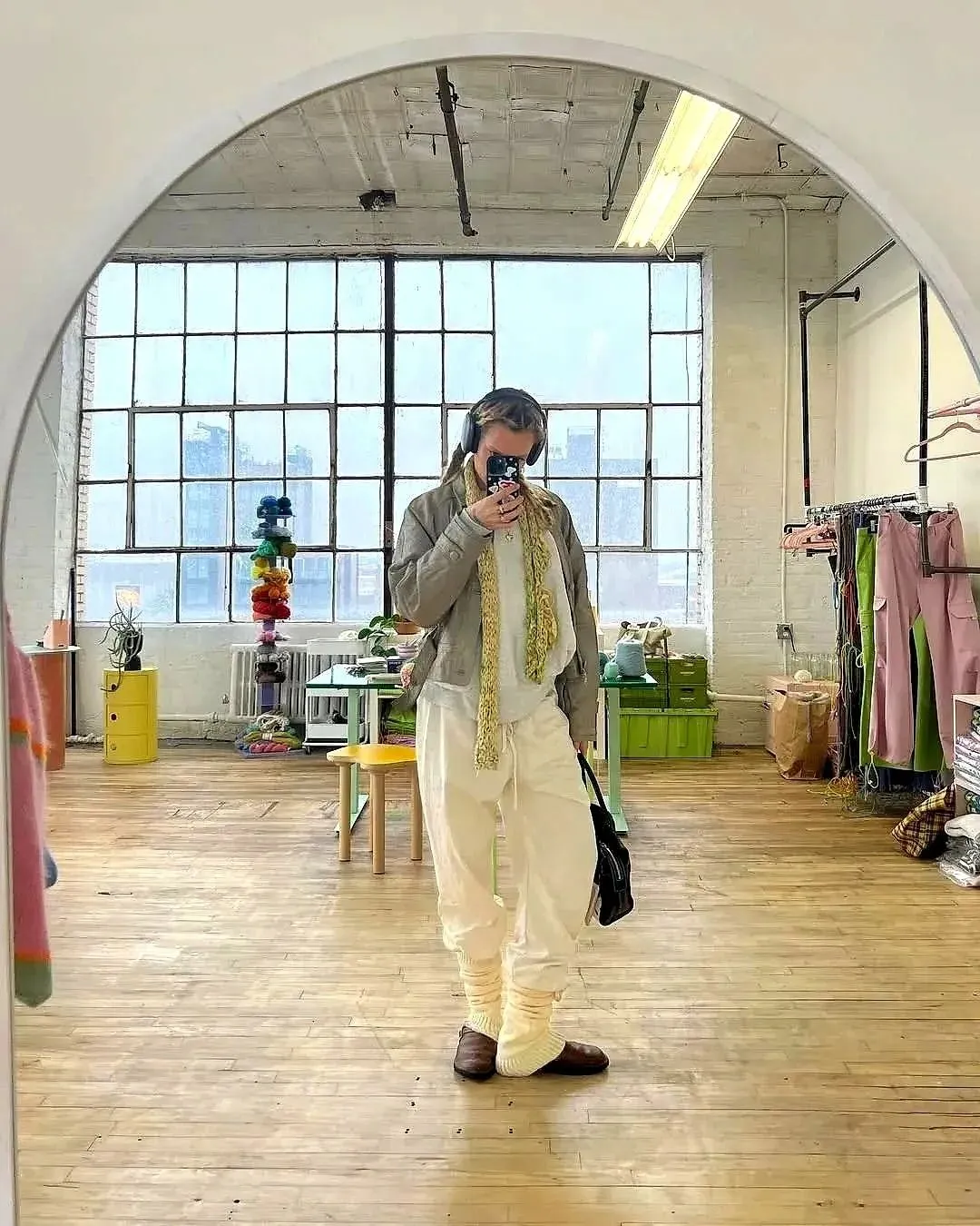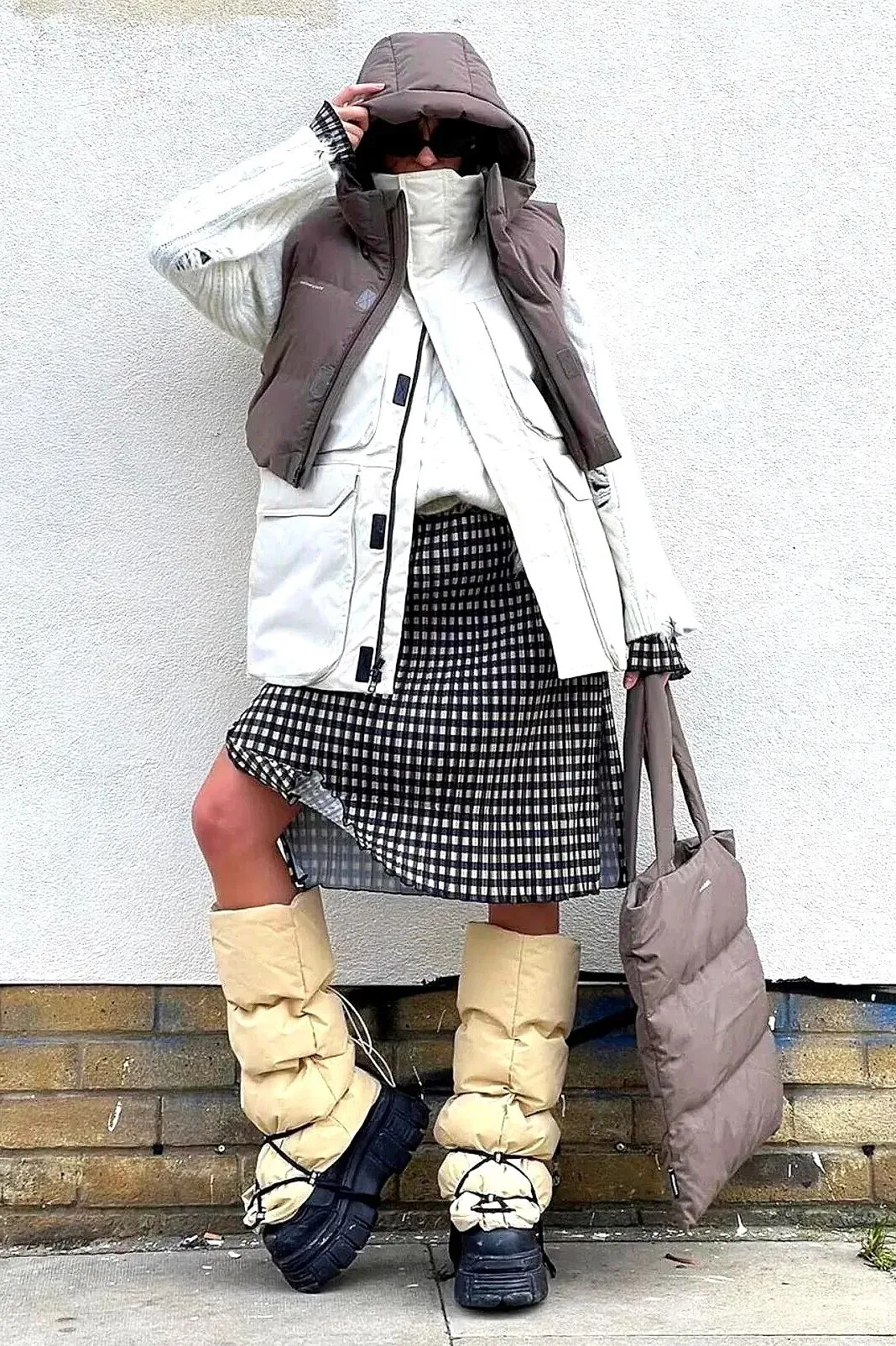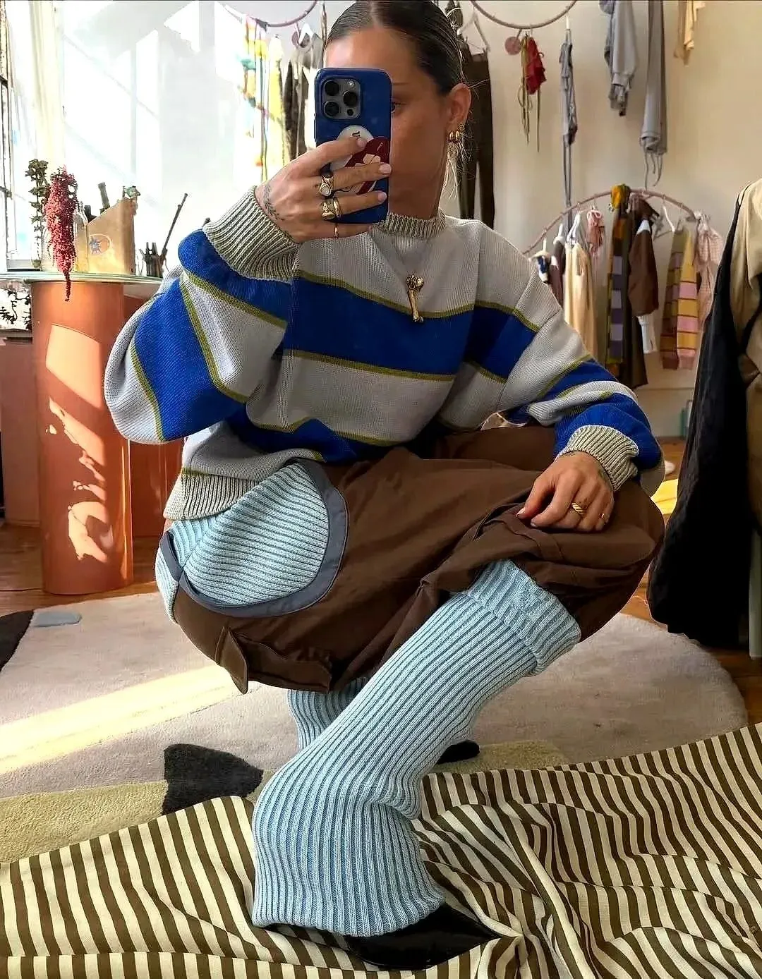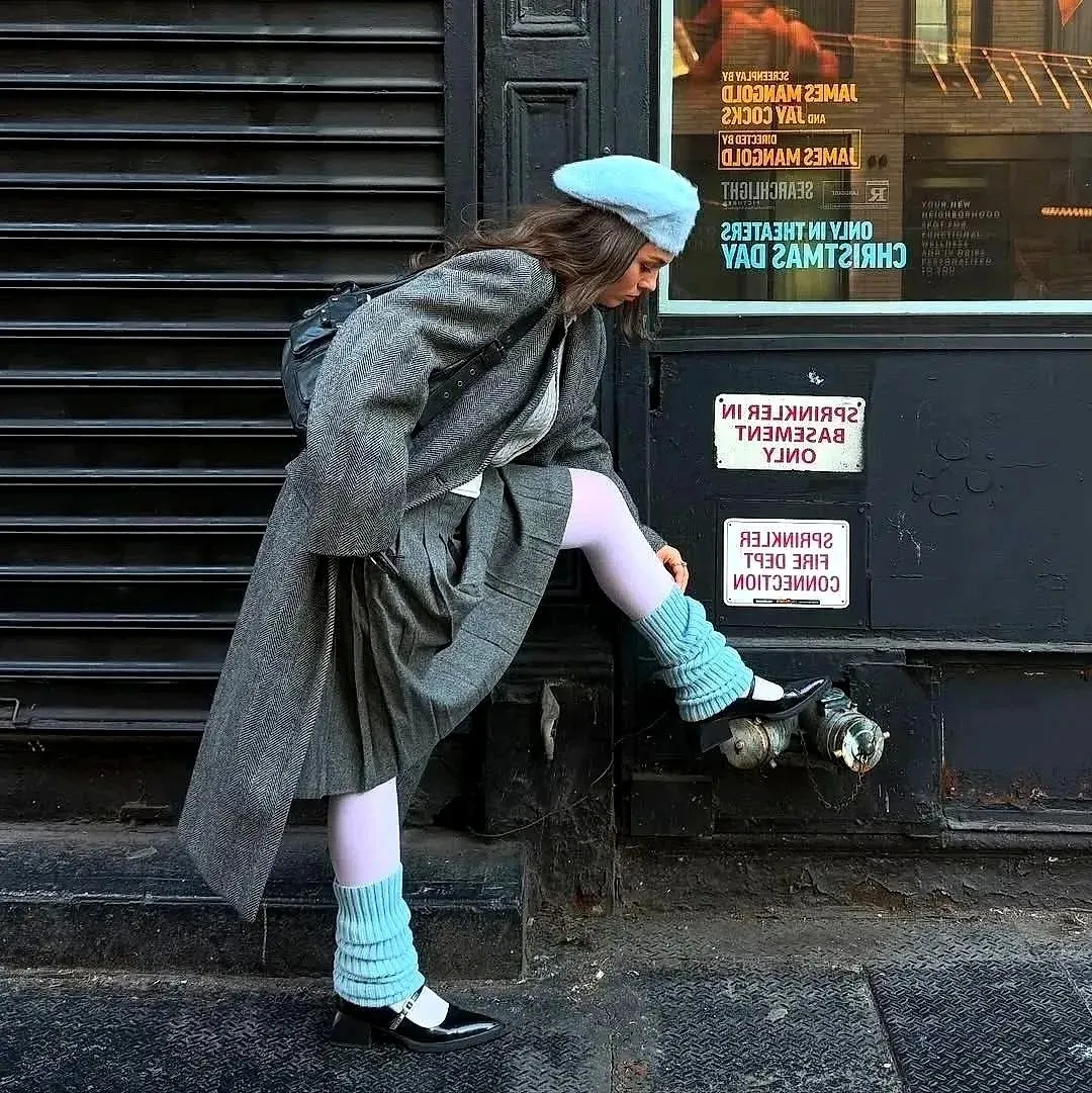 最不.容易.出错.的是「顺色搭.配」。比如米.灰袜套.配燕.麦裤,浅咖袜.套配.卡其.裙,深灰.袜套配.藏蓝裤,颜色.在一个.色系.里,整体会.特别顺眼。看起来.不刻意,但有层.次。