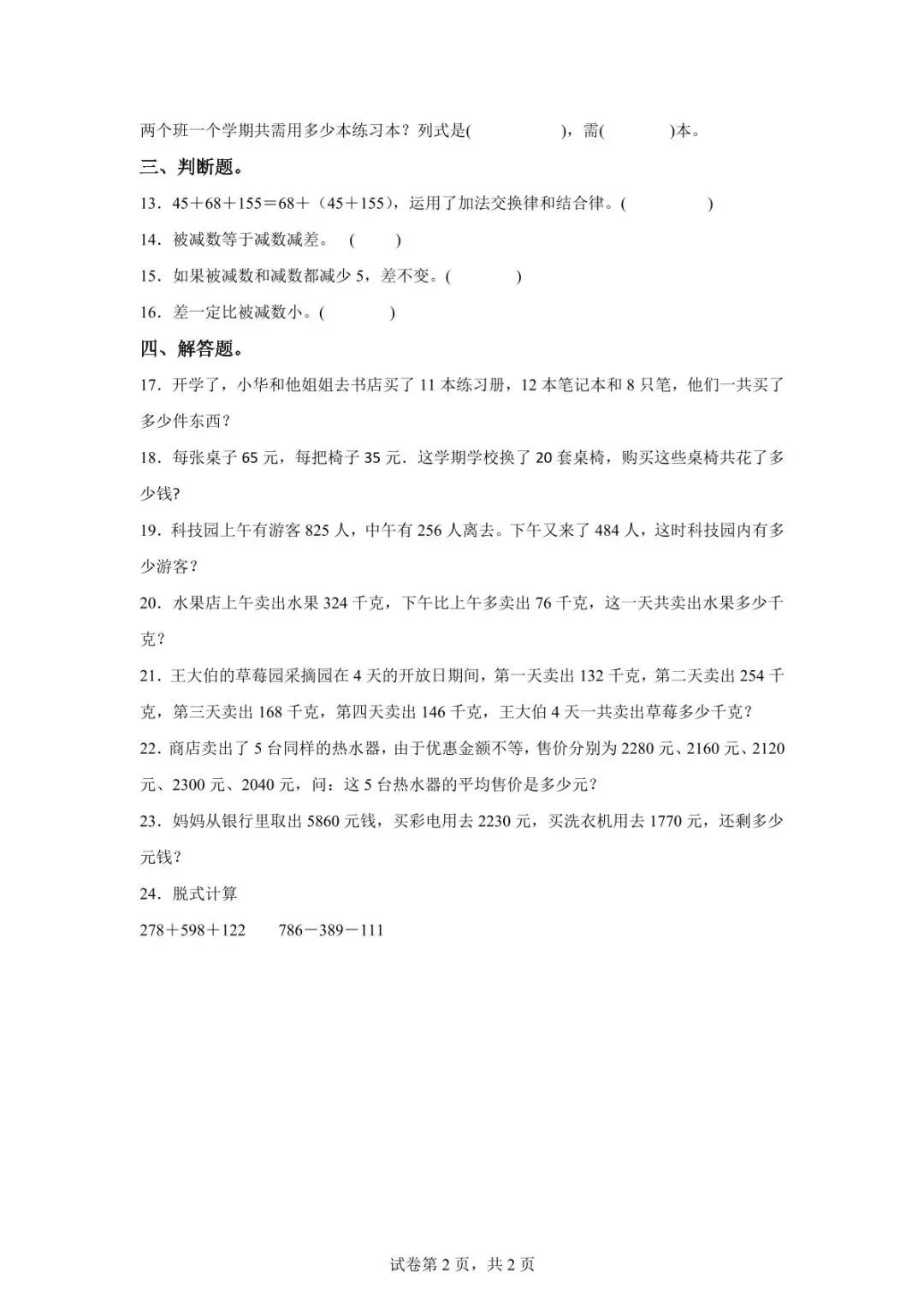 同步小学数学四年级上册/下册核心单元(适配人教版主流版本),针对《加减法的关系和加法运算律》专项命题,标准单元检测卷,满分100分,建议答题时长60分钟,贴合四年级学情与校内考试要求,可直接打印使用。