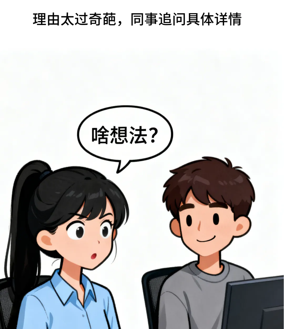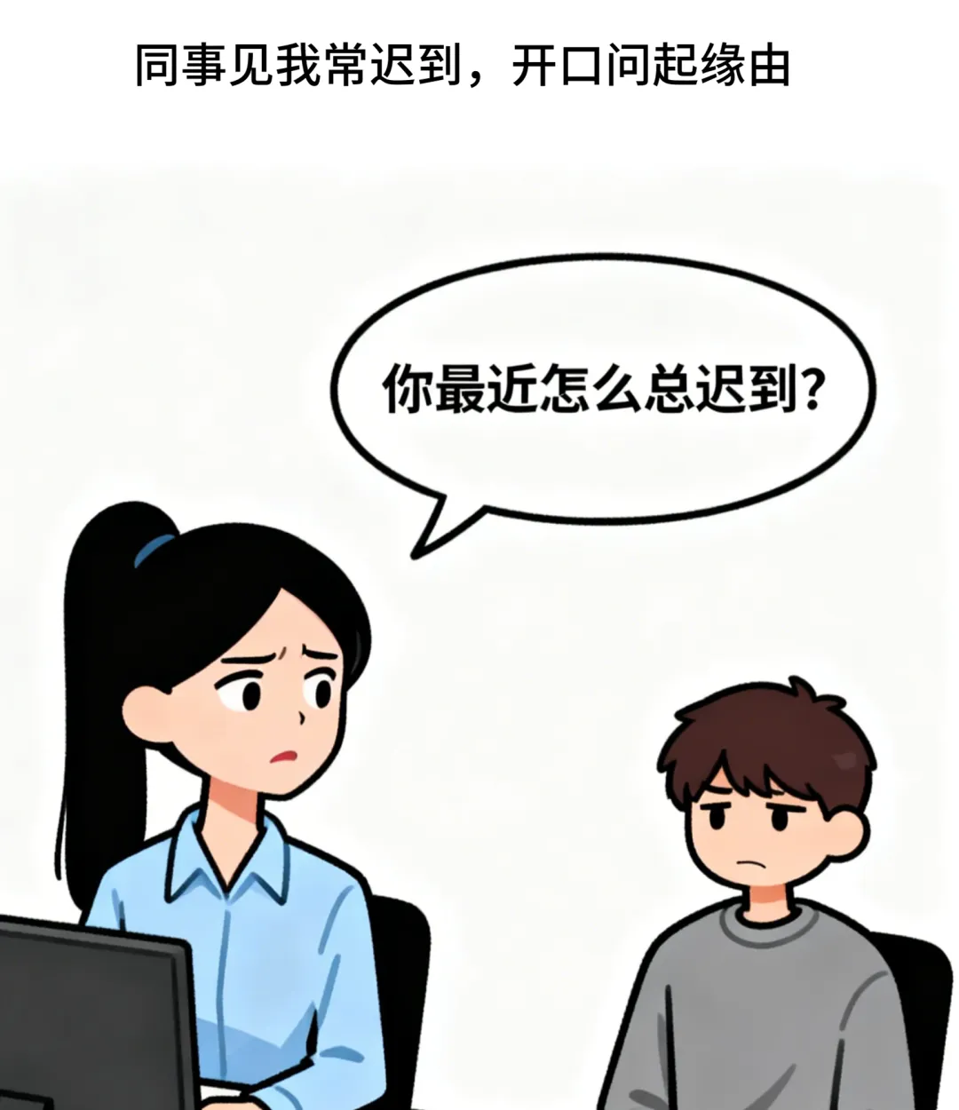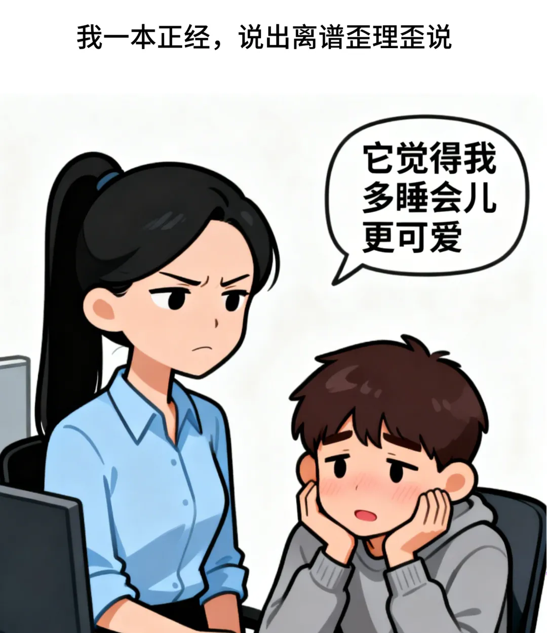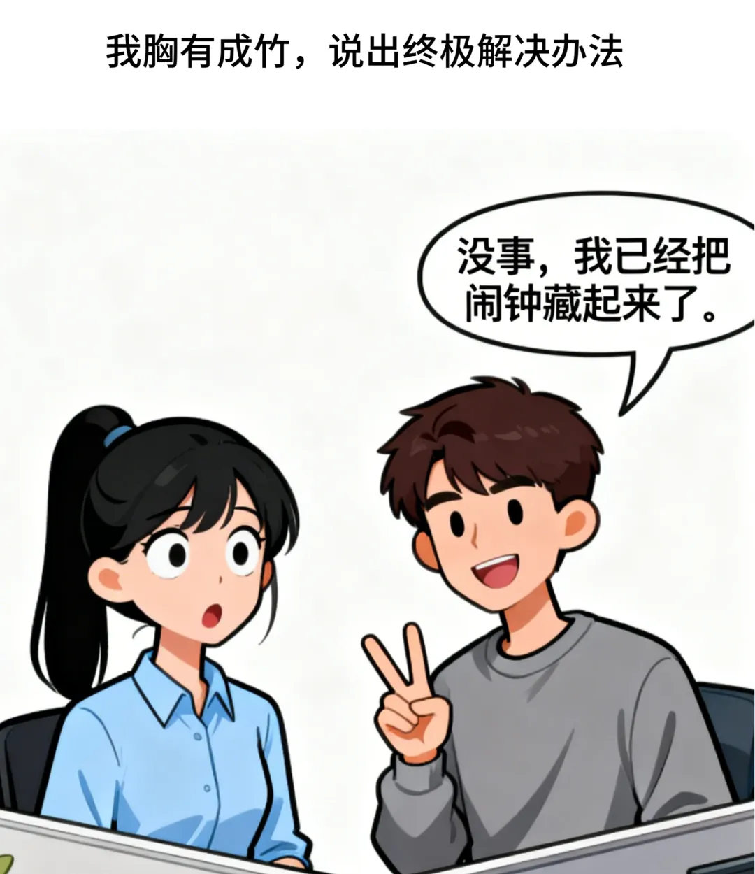 趣味漫画:甲:你最近怎么总迟到?乙:我家闹钟有想法,觉得我多睡更可爱.甲:老板可不这么想.乙:没事,我把闹钟藏起来了.