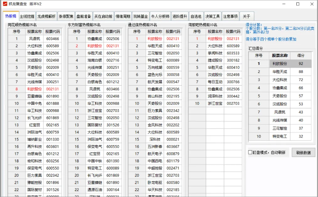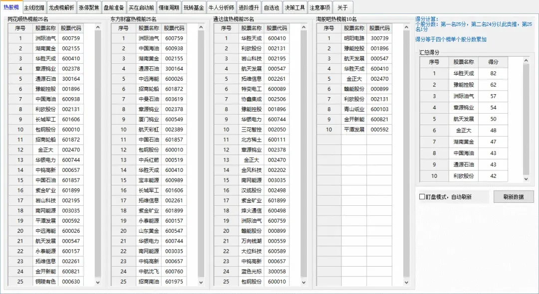 热股榜统计了同花顺、东方财富、通达信、淘股吧的前25名热门股票,并在右侧做了汇总。展示同花顺、东方财富、通达信这三个主流软件的前25名热门股票,都全给你列出来了,还有淘股吧热度前10名,可以说是一网打尽!不管你相信哪个吧,反正都给你列出来了,一眼就能看明白,虽然淘股吧只有10名,但含金量还挺高的。右侧还有一个得分计算,得分等于四个榜单个股分数累加,并且还可以打开“盯盘模式”,勾选该模式,板块1分钟刷新一次。