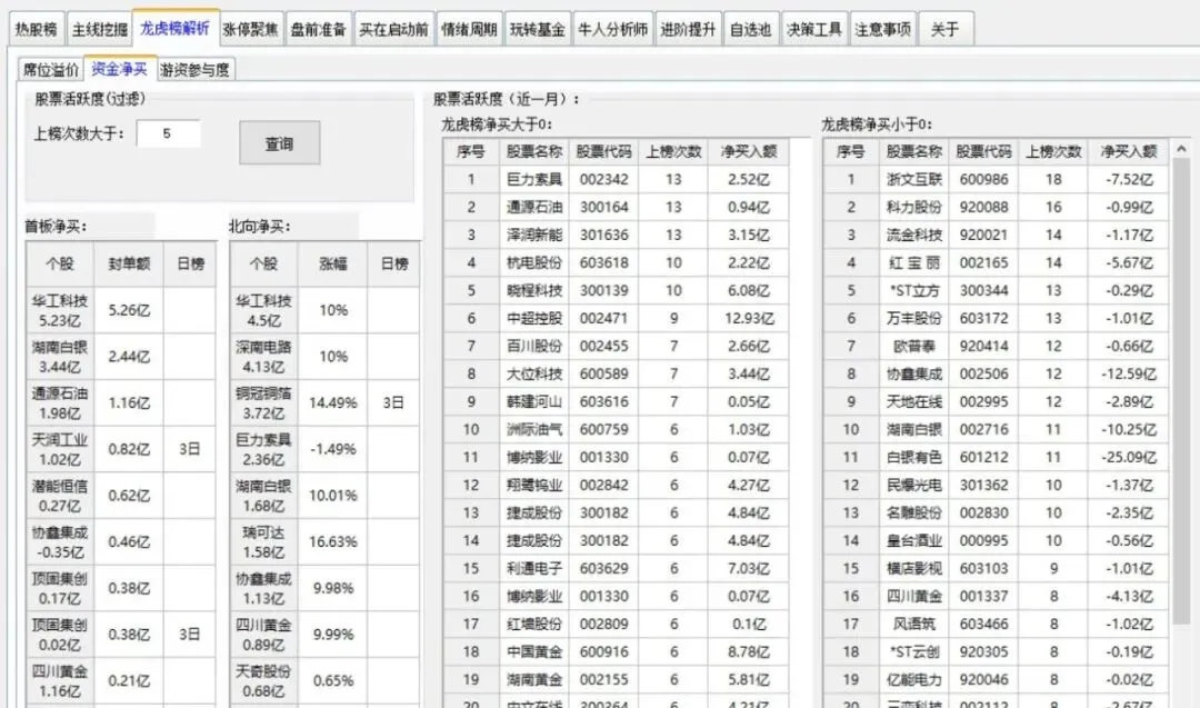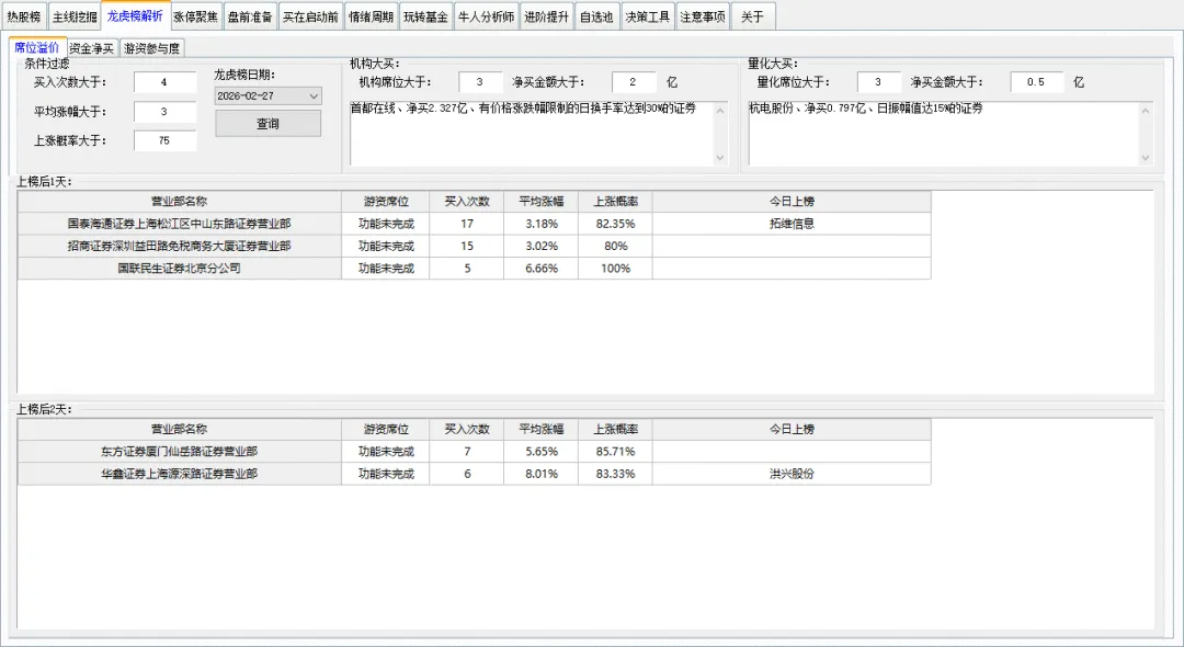 龙虎榜解析还可以查看席位溢价、资金净买和游资参与度,了解市场主力动态方向。相比于其他龙虎榜,这个最大的优点是,根据历史数据,统计了不同席位买入后的上涨概率。通过界面来看,感觉可以设置什么买入次数、设置上涨概率概率是多少,这个大家玩股票的,应该能明白。