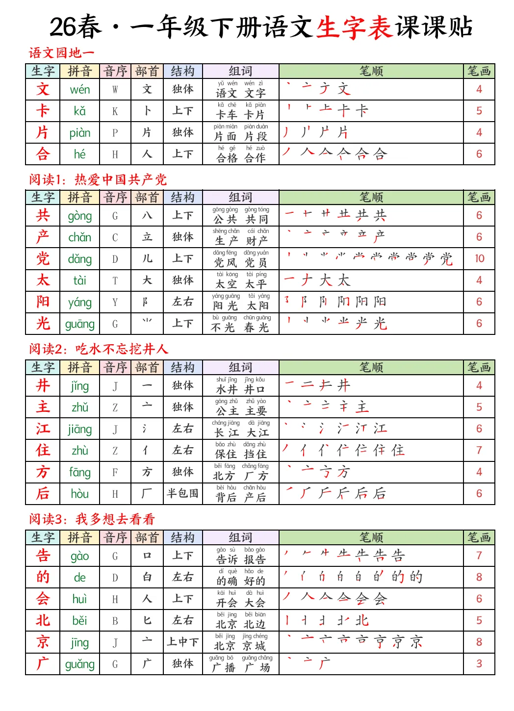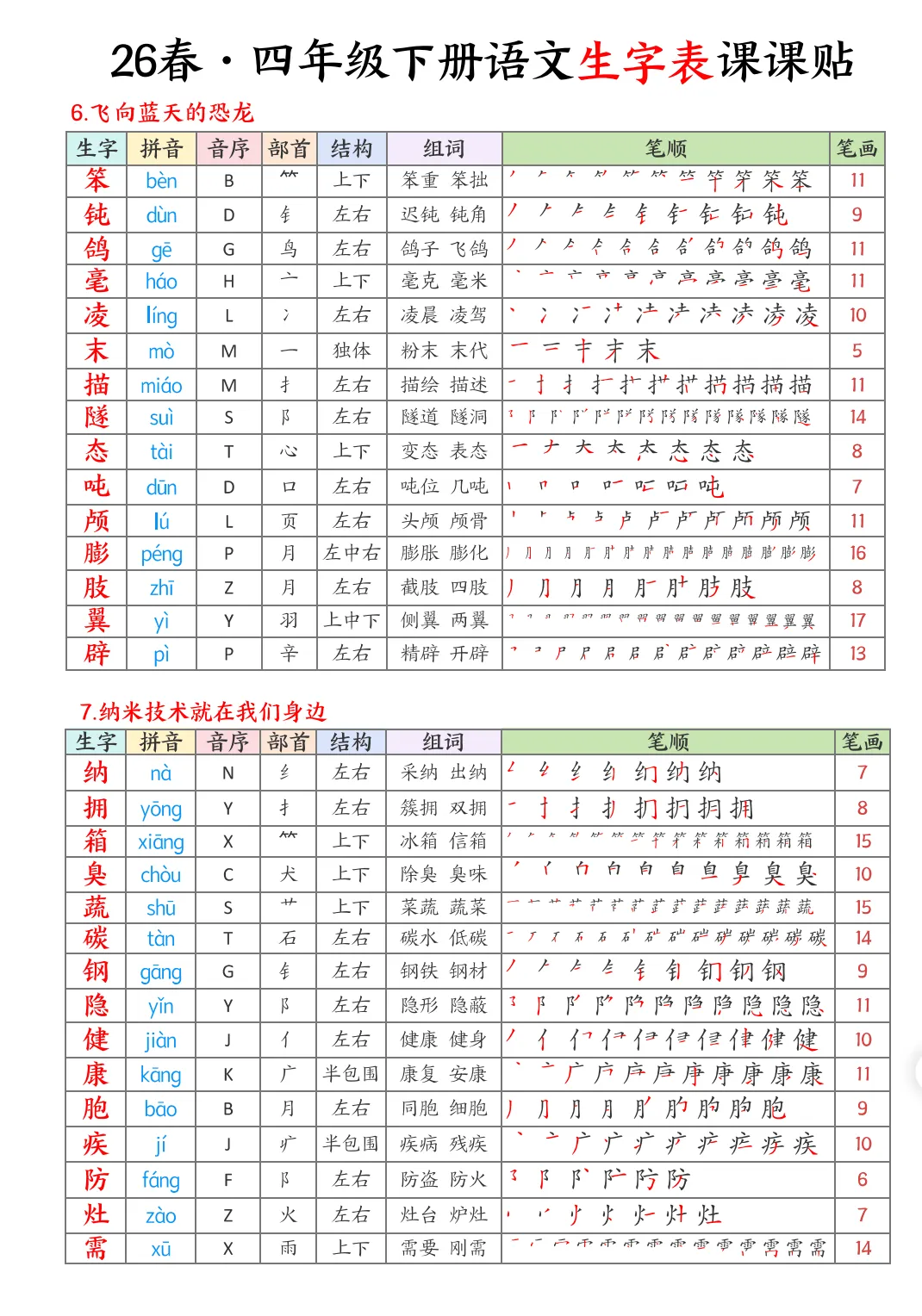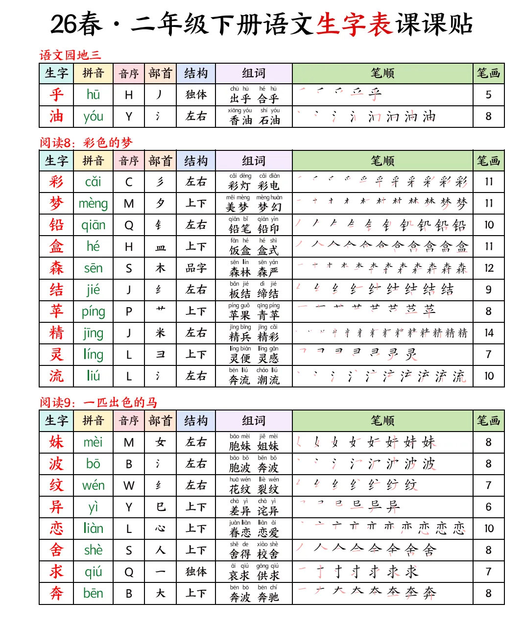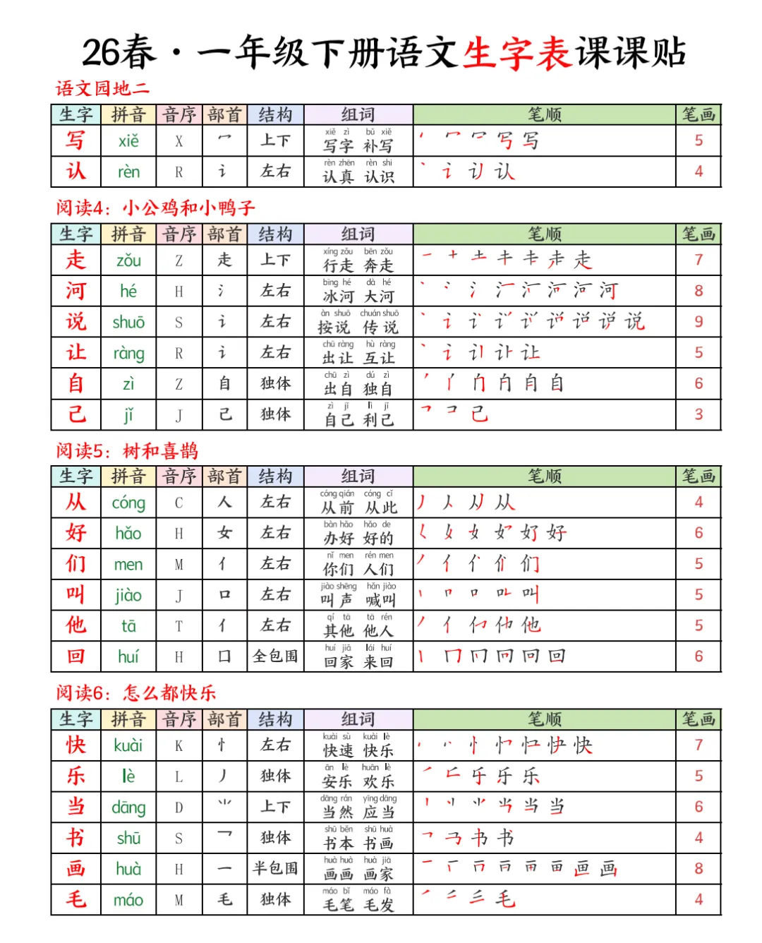 今天给大家分享的是:2026春1~6年级语文下册,生字表课课贴(可打印)。可直接打印使用。完整电子版详见文末网盘下载链接。欢迎收藏和下载。如果觉得这份资料不错,建议分享到班级群,让其他家长打印出来,帮助孩子学习,如果觉得合适,请支持正版!