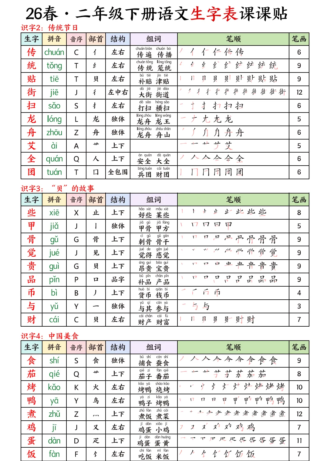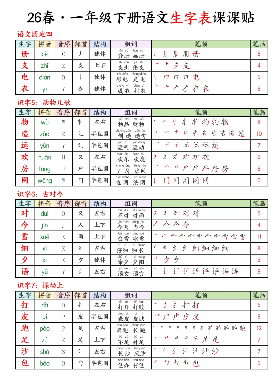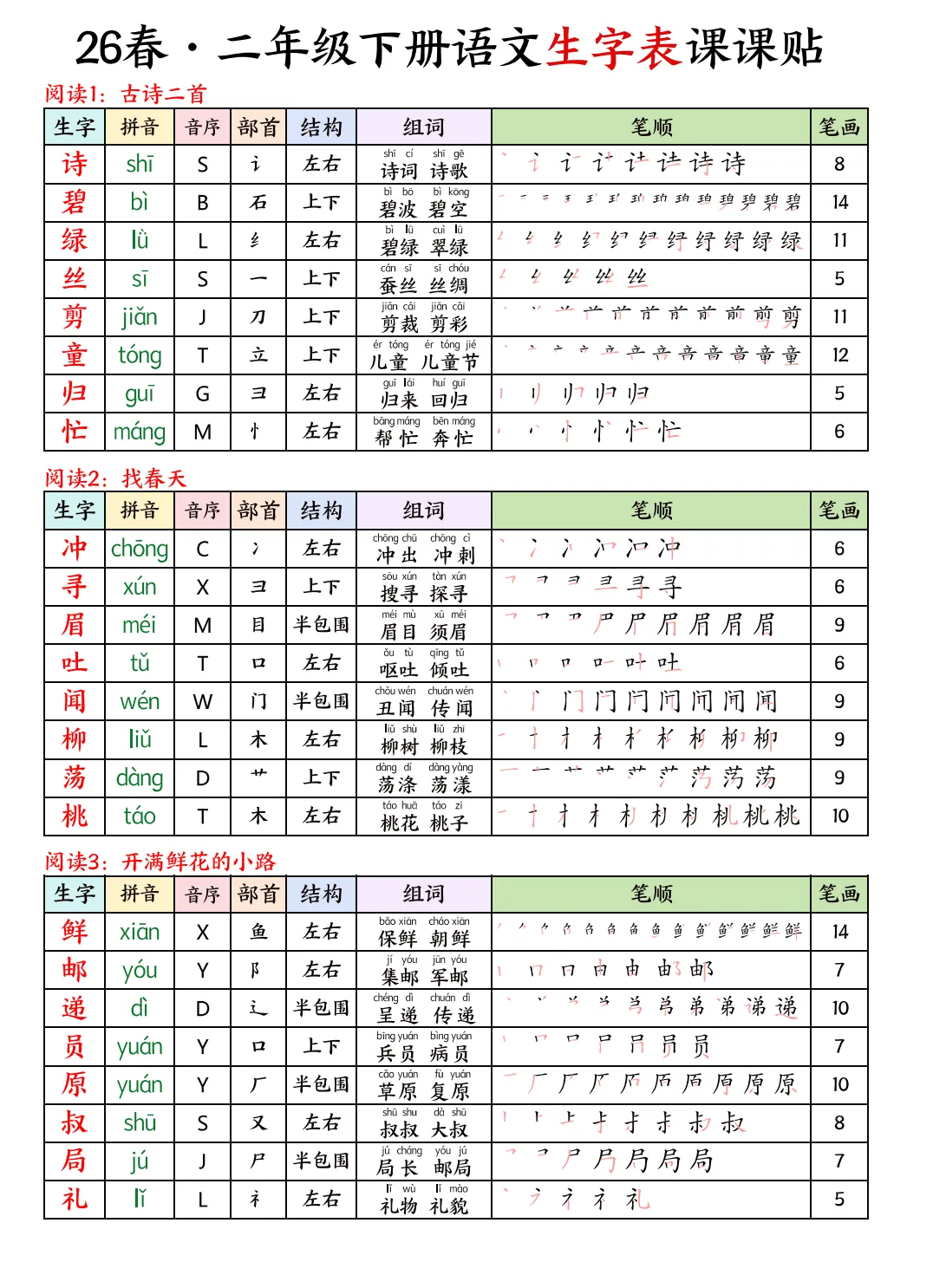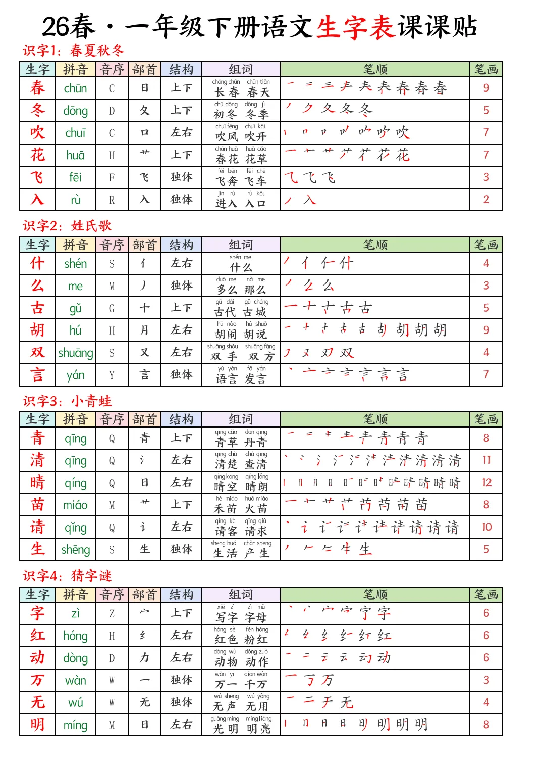 今天给大家分享的是:2026春1~6年级语文下册,生字表课课贴(可打印)。可直接打印使用。完整电子版详见文末网盘下载链接。欢迎收藏和下载。如果觉得这份资料不错,建议分享到班级群,让其他家长打印出来,帮助孩子学习,如果觉得合适,请支持正版!