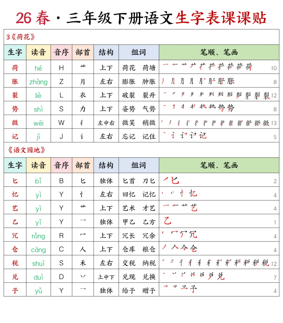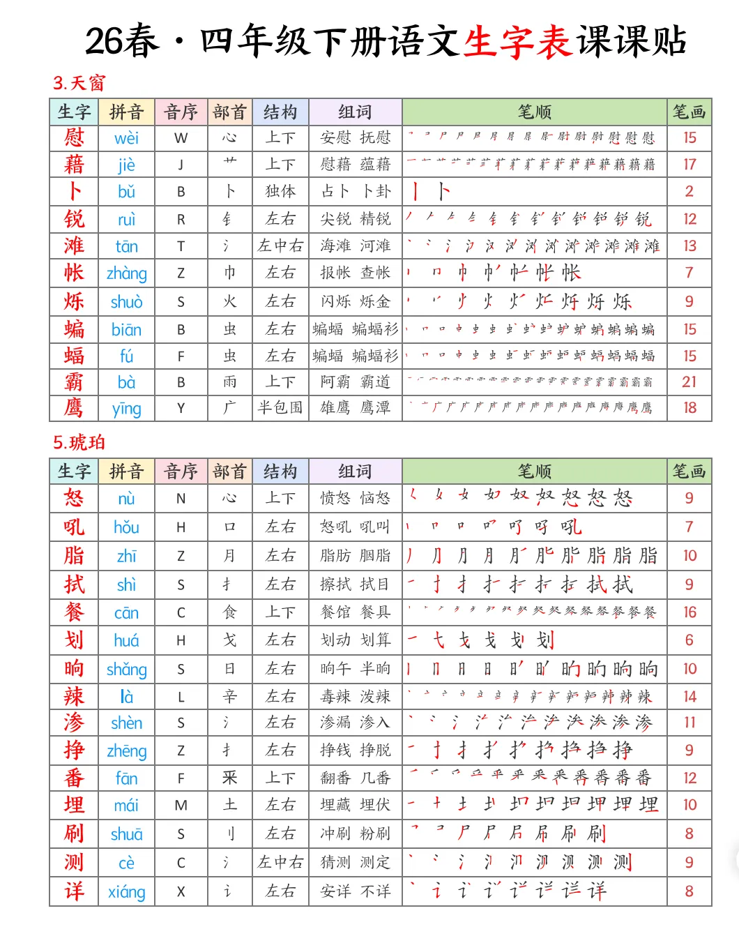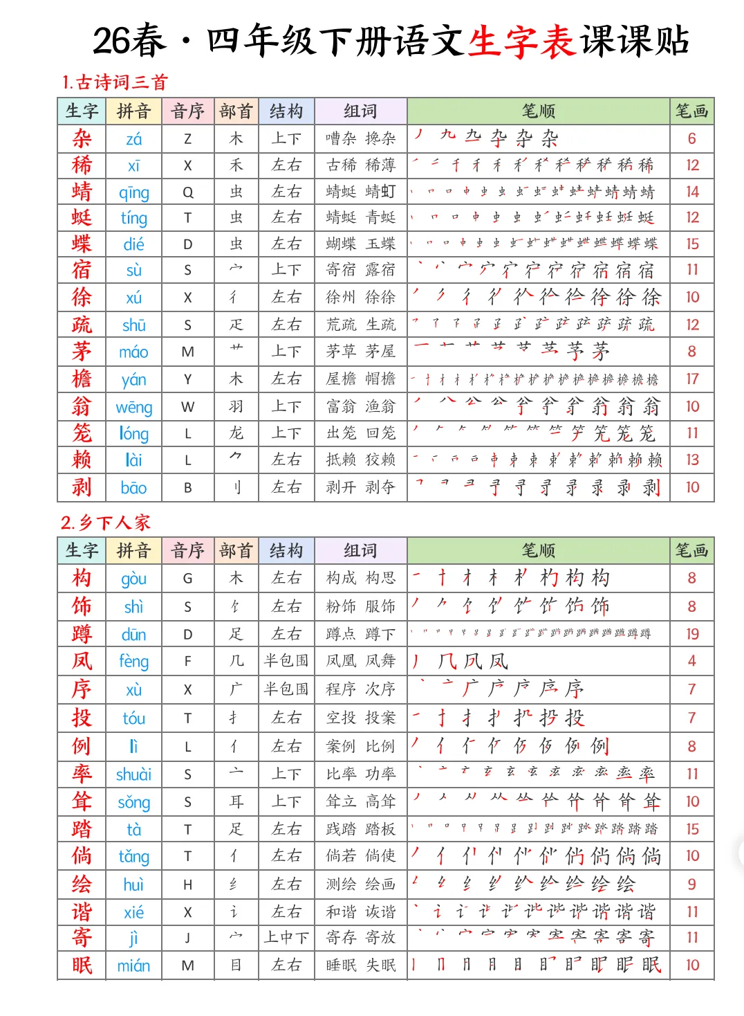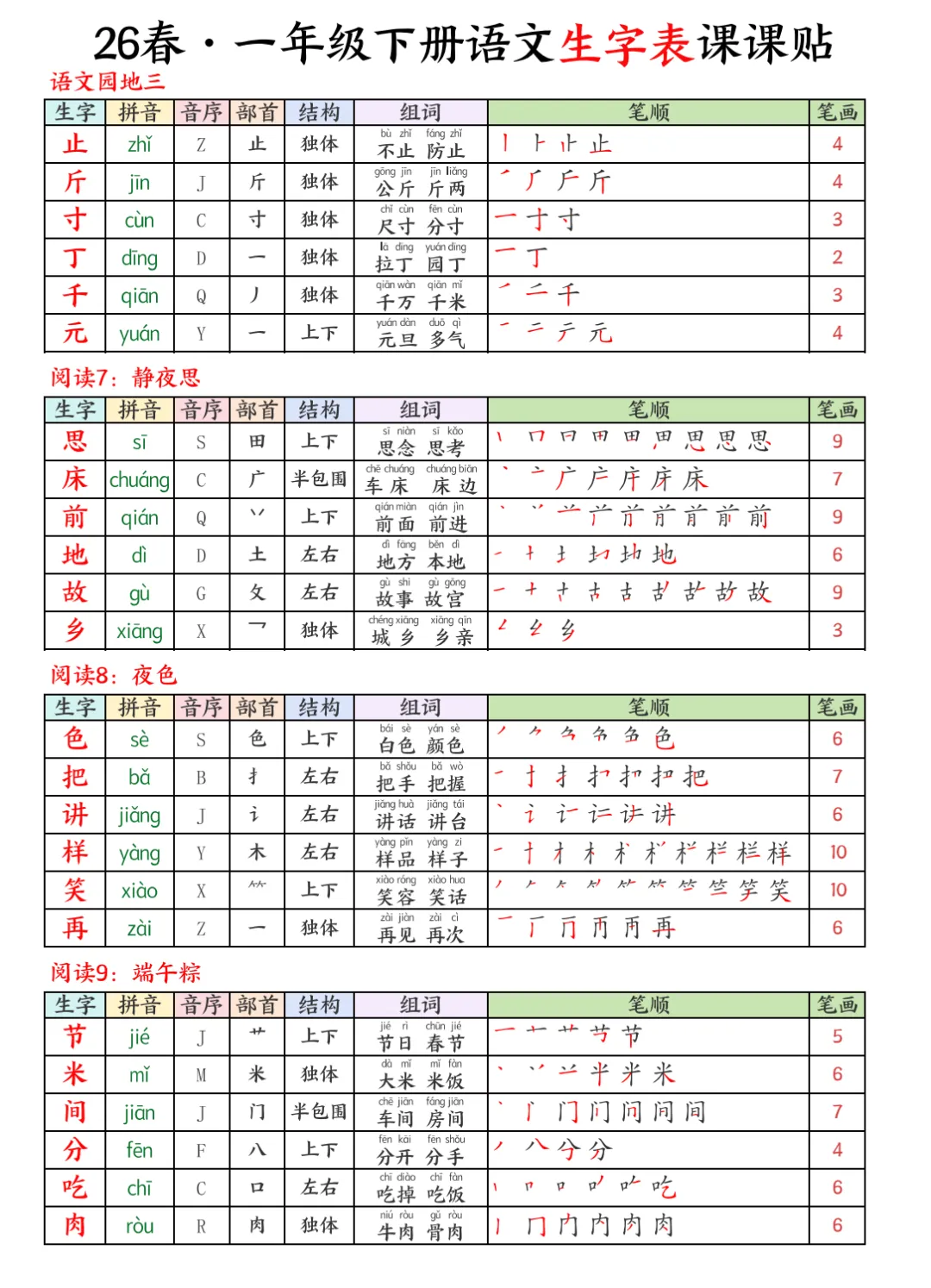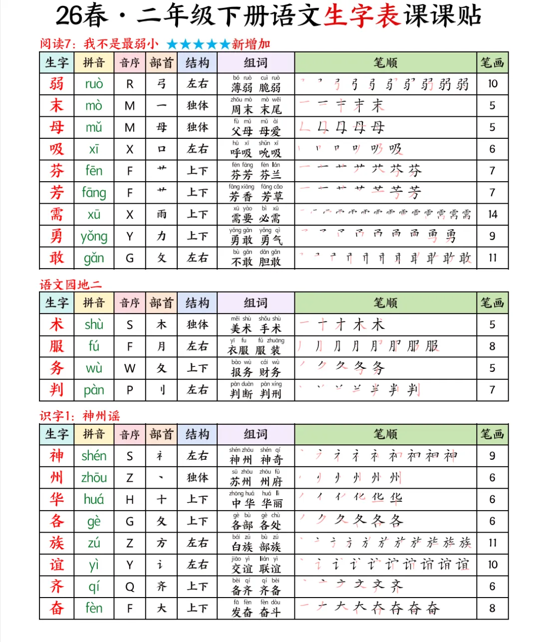今天给大家分享的是:2026春1~6年级语文下册,生字表课课贴(可打印)。可直接打印使用。完整电子版详见文末网盘下载链接。欢迎收藏和下载。如果觉得这份资料不错,建议分享到班级群,让其他家长打印出来,帮助孩子学习,如果觉得合适,请支持正版!