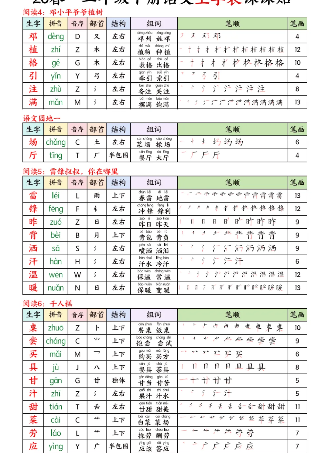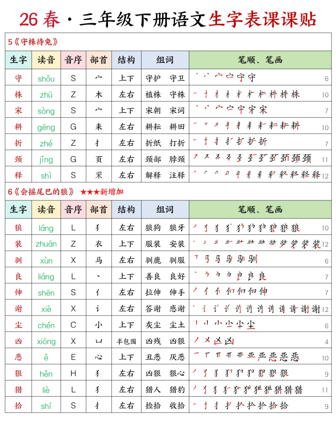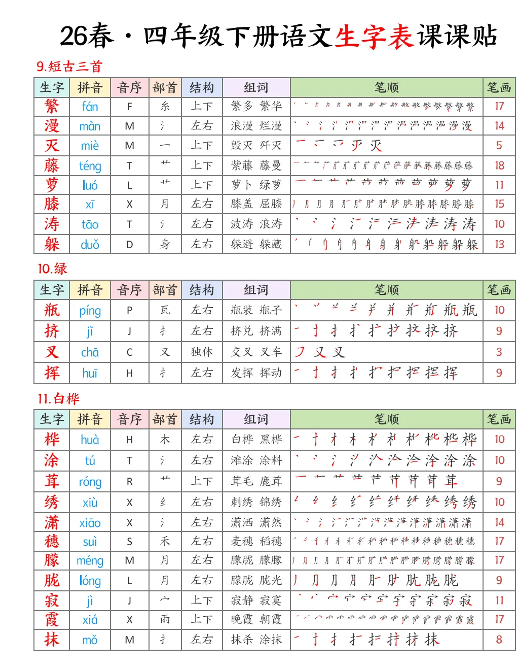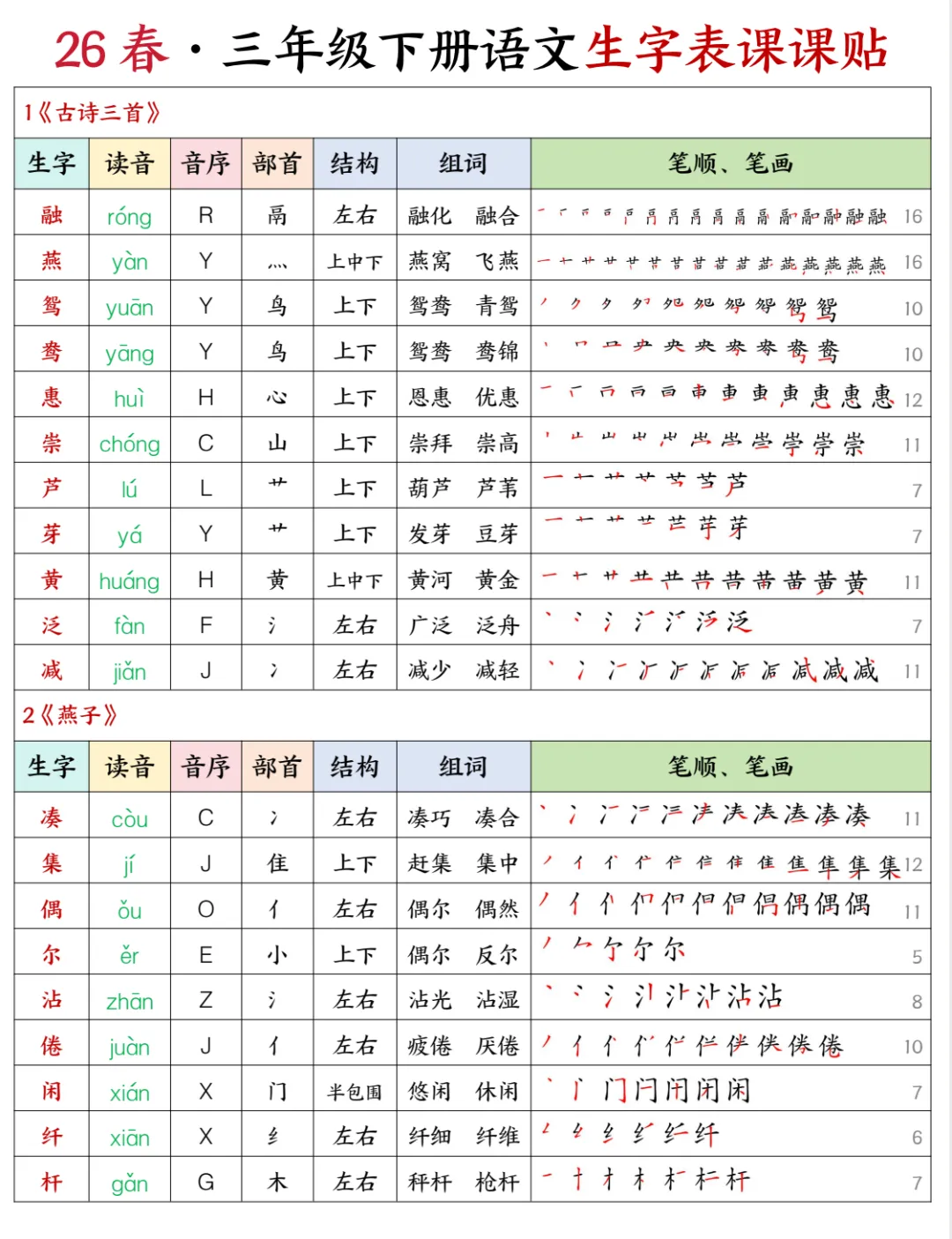 今天给大家分享的是:2026春1~6年级语文下册,生字表课课贴(可打印)。可直接打印使用。完整电子版详见文末网盘下载链接。欢迎收藏和下载。如果觉得这份资料不错,建议分享到班级群,让其他家长打印出来,帮助孩子学习,如果觉得合适,请支持正版!