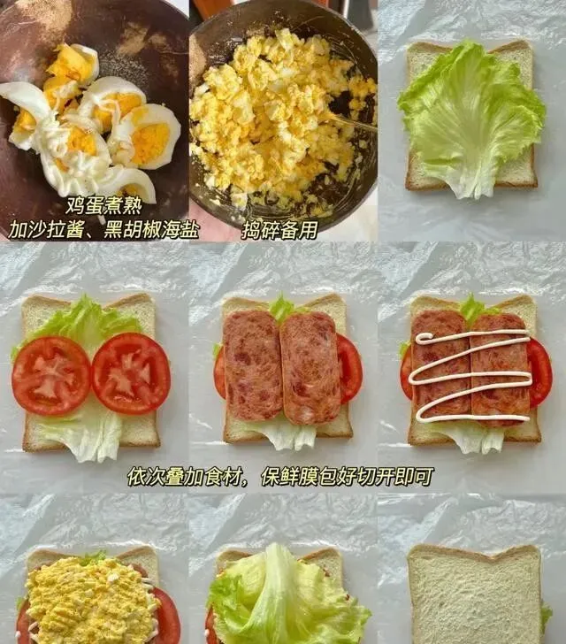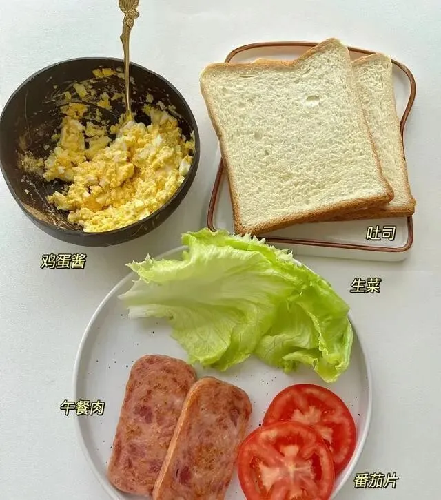 吐司 , 生菜 , 西红柿 , 午餐肉 , 沙拉酱 , 还有鸡蛋酱 , 就这些 , 没了!减脂的姐妹可以把白吐司换成全麦的 , 热量低一些 , 口感也不差的 , 放心~