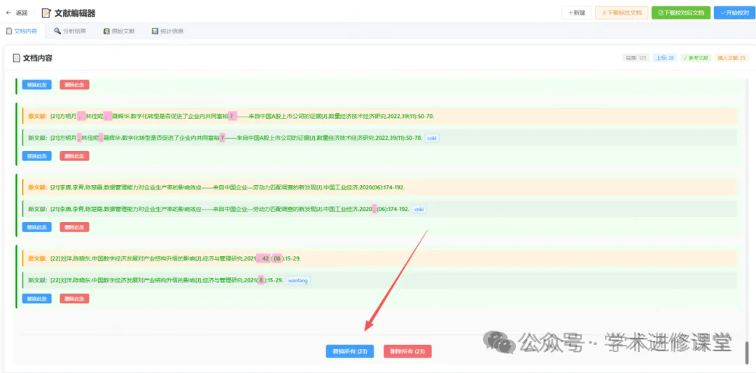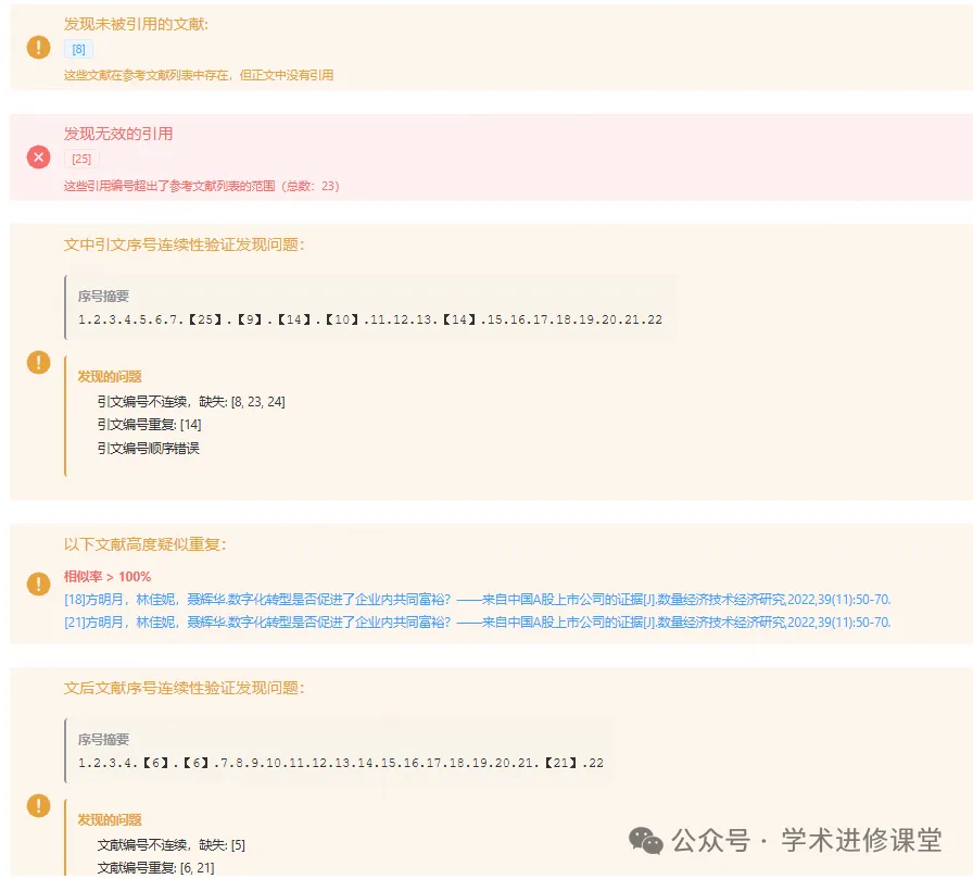 有时候删了一段文字,忘了删对应的参考文献,导致正文里的上标序号和文末文献对不上。系统会自动检测这种“无效引用”,帮你标出来。