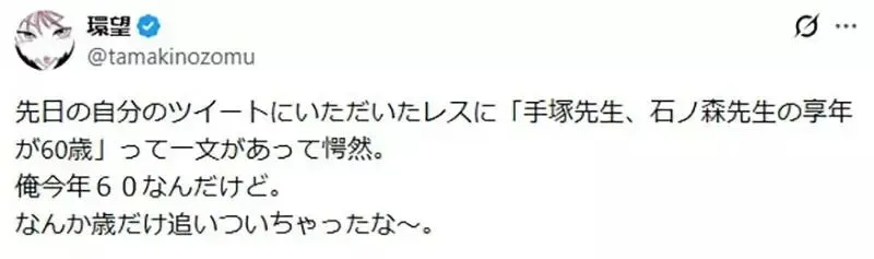 以《吸血鬼同盟》闻名的日本漫画家环望,即将在 2026 年 10 月 7 日迎来 60 岁生日。但相较于年满 60 岁的喜悦,他心中更多的是忐忑与谨慎 —— 只因他发现,手塚治虫、石森章太郎等漫画界大前辈,均在 60 岁这一年离世,这让即将步入同龄的他倍感压力。