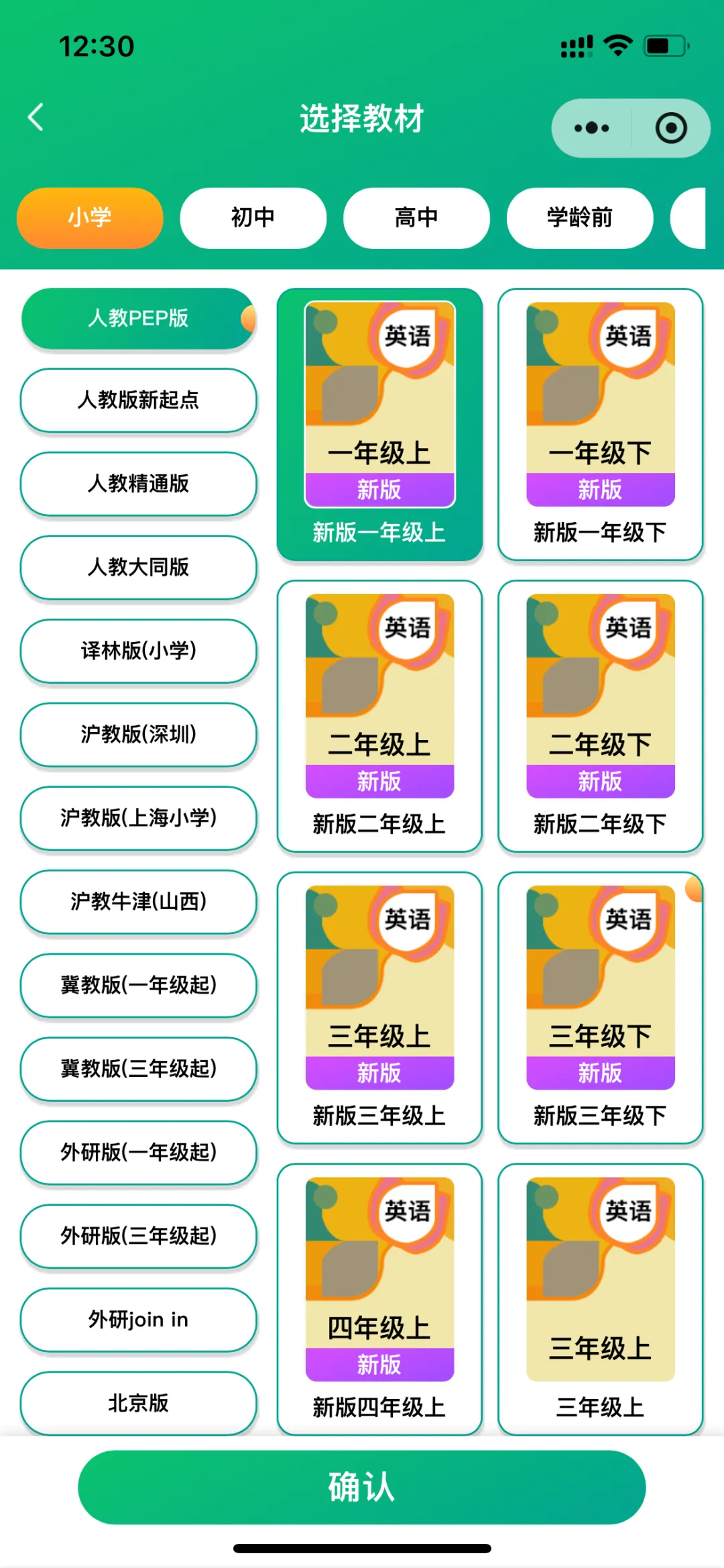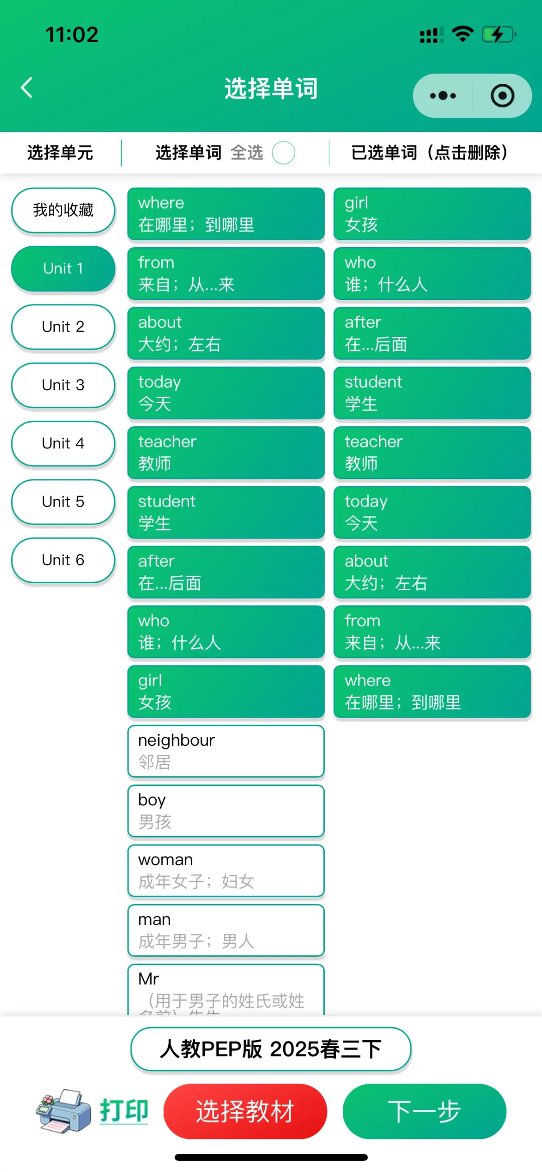 在【课本教材】里,孩子可以自主选择各版本、各单元的单词,灵活组合“导学模式”和“测试模式”下多维度的练习方式,进行针对性专项训练。