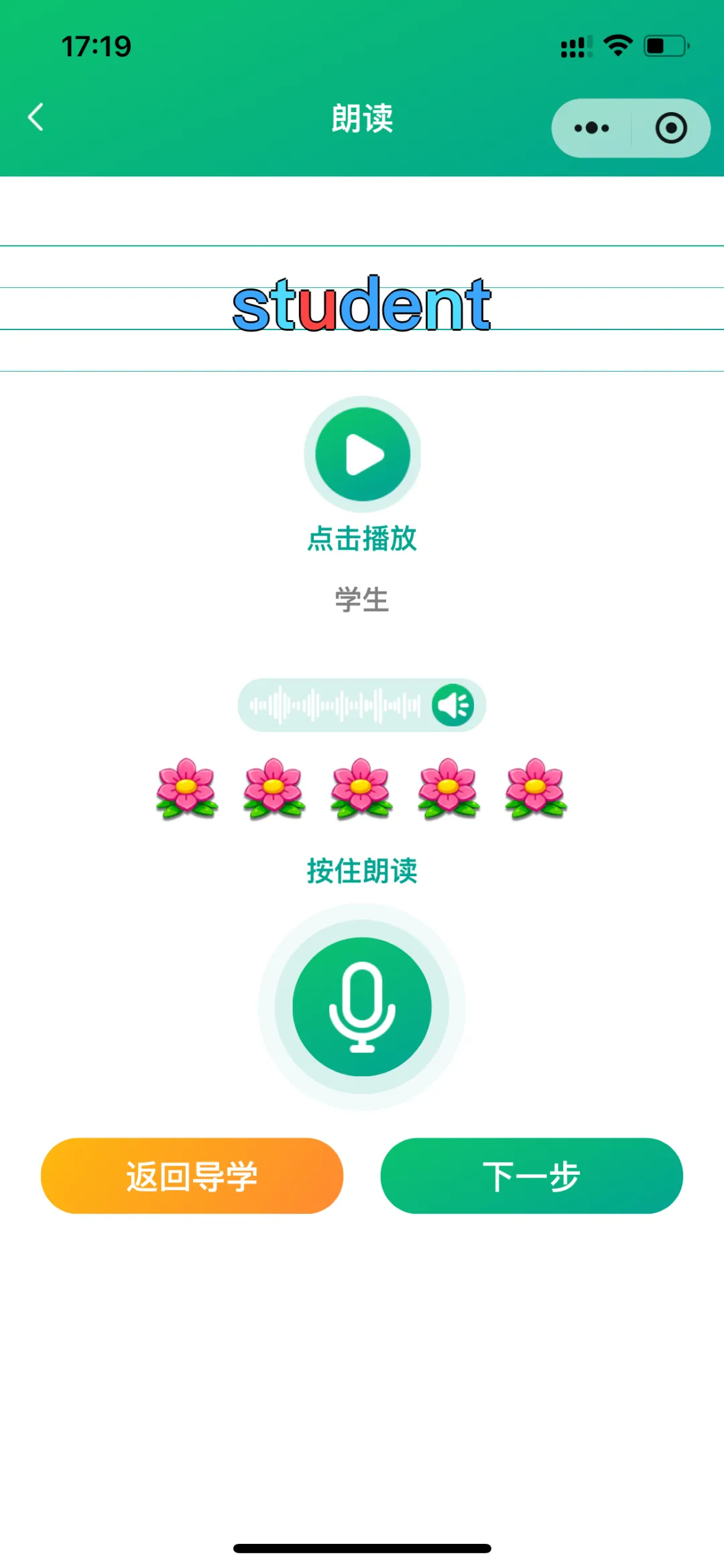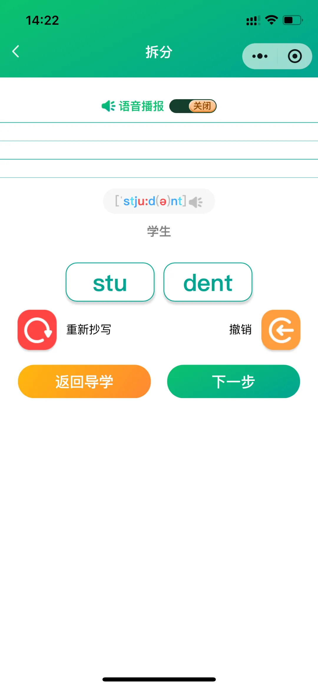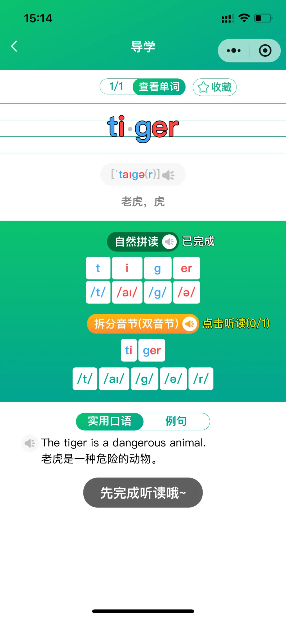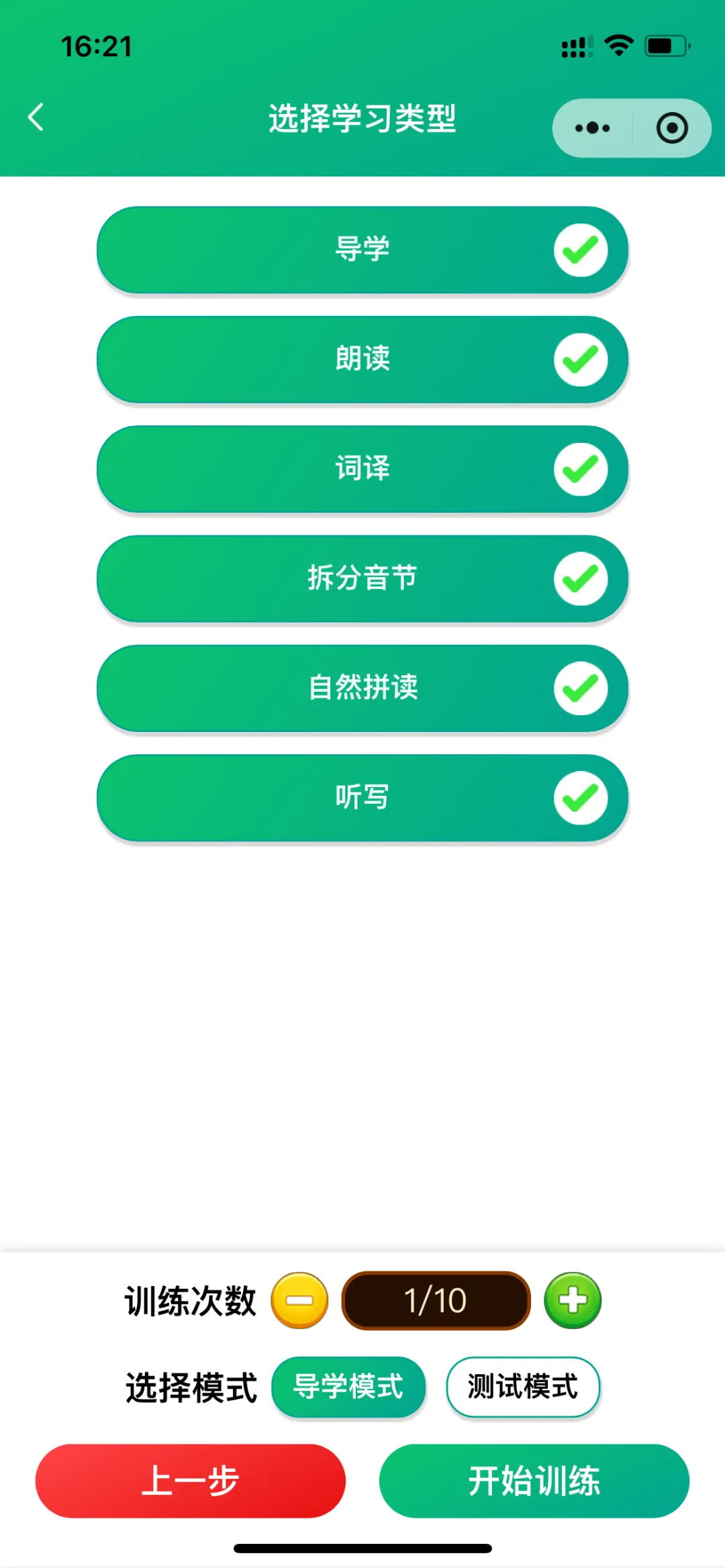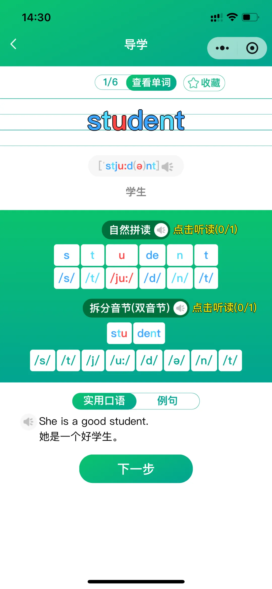 导学模式包括:导学、跟读测评(AI智能)、单词答题、拆分音节练习、自然拼读练习、听写;