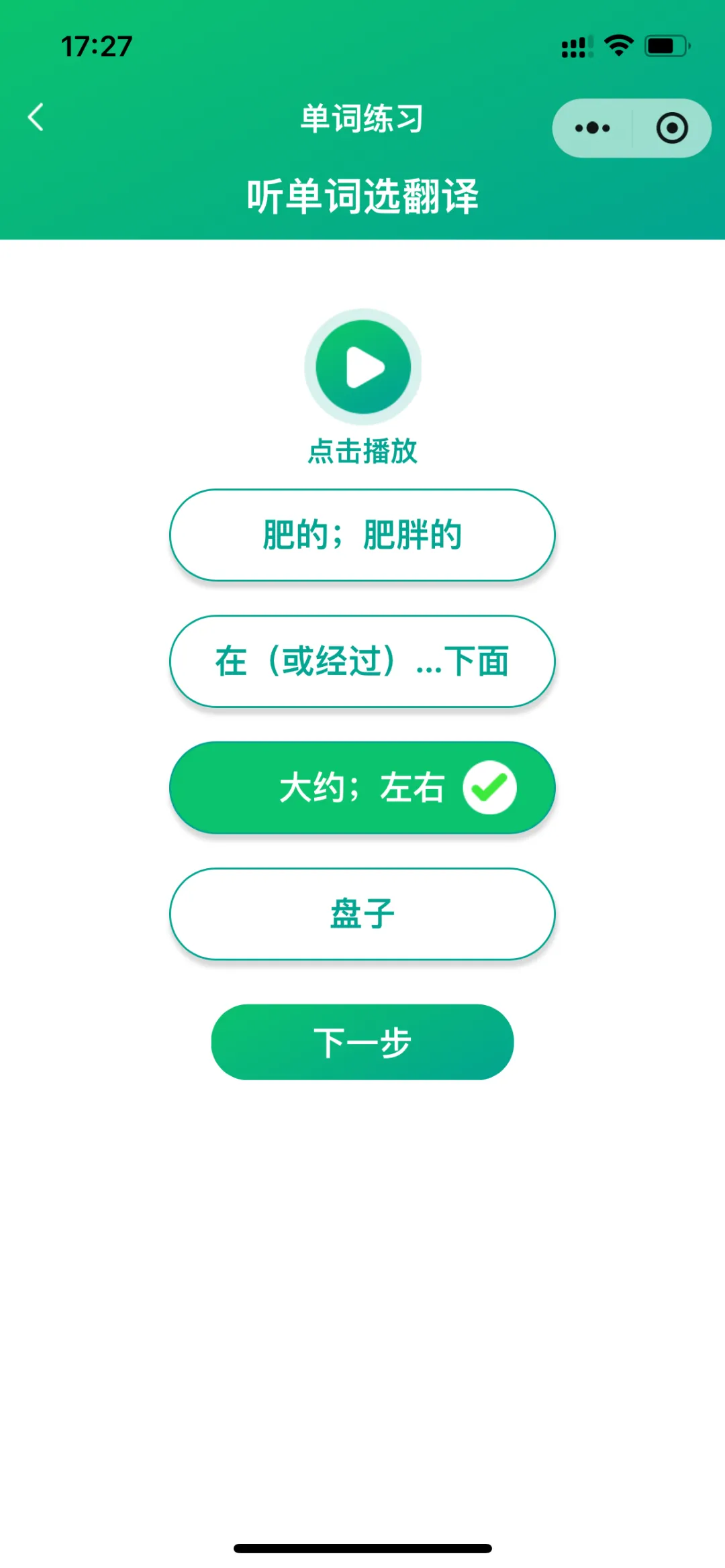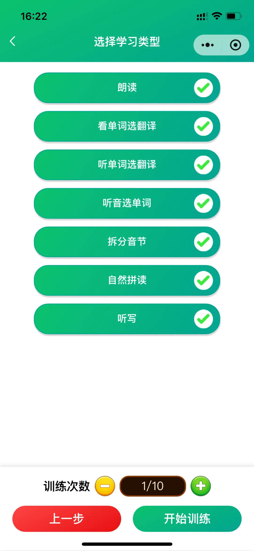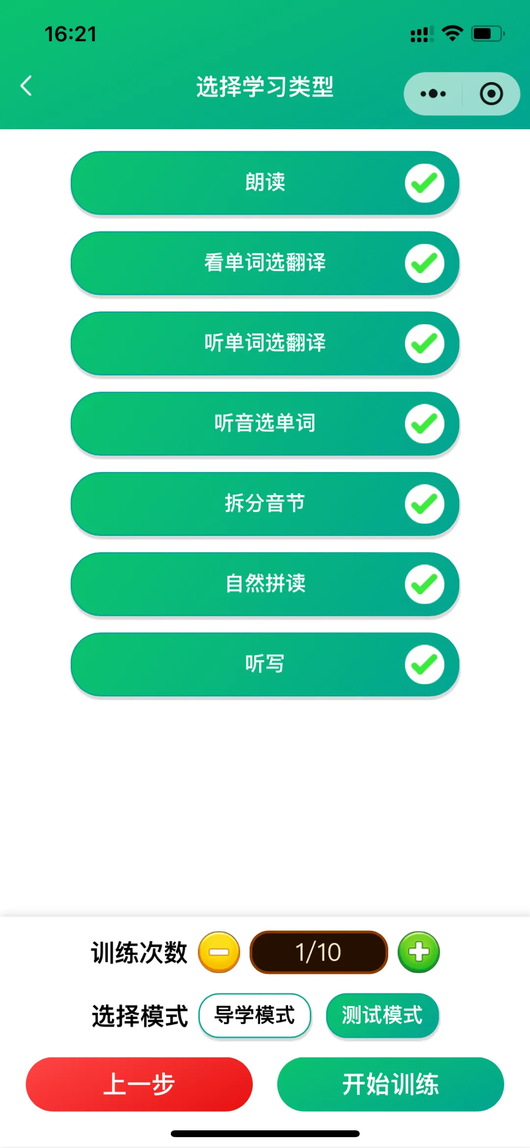 测试模式包括:跟读测评(AI智能)、看单词选翻译、听单词选翻译、听单词选单词、拆分音节练习、自然拼读练习、听写。