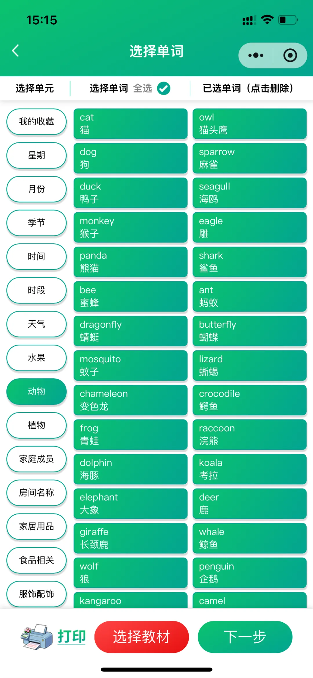 在【专题模块】里,『背单词花园』设置了日常生活中41个常用的单词类别,孩子可以自主选择类别下的单词,灵活组合“导学模式”和“测试模式”下多维度的练习方式,进行系统性的训练和记忆,全方位提升单词学习效果。