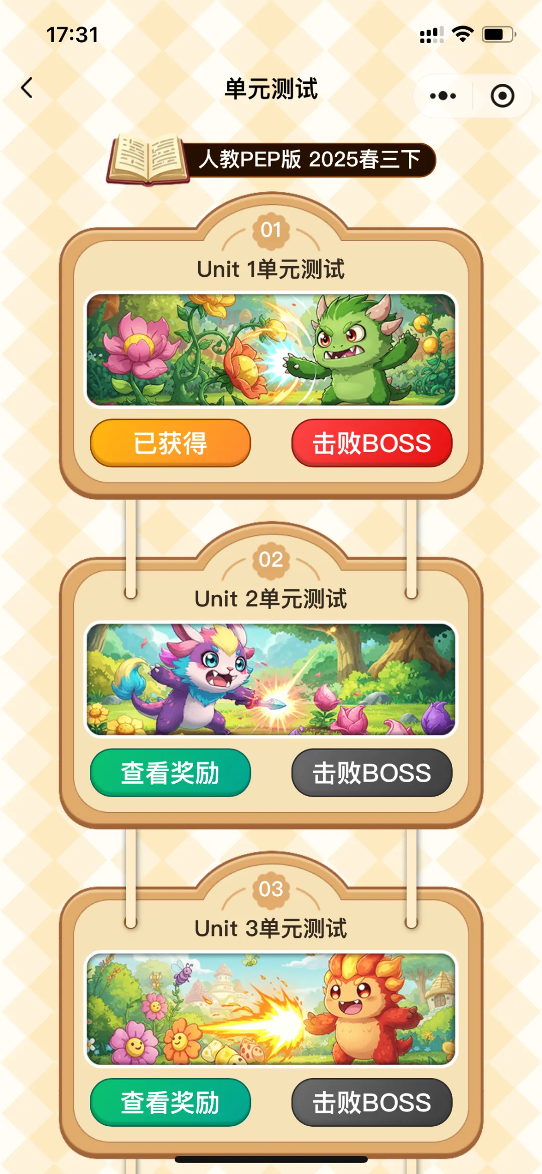 『背单词花园』还设置了“单元测试”环节,将每个单元的单词测试,巧妙设计为“击败BOSS”的游戏闯关方式,让孩子在趣味闯关中巩固所学知识。
