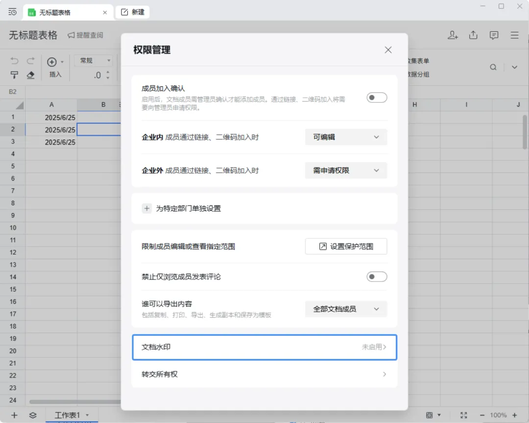 3、操作路径:打开文档,点击文档顶部菜单栏“三” ->权限管理->文档水印->开启/关闭。