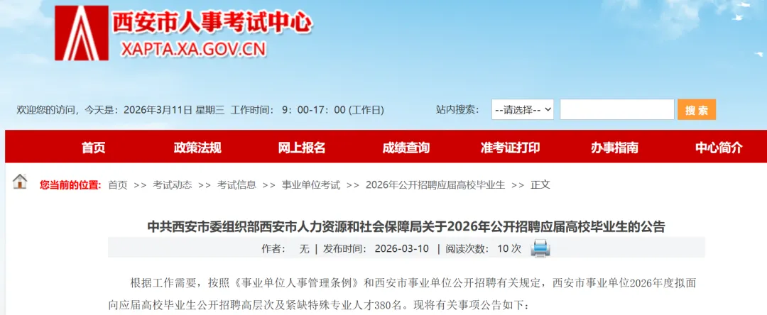 中共西安市委组织部西安市人力资源和社会保障局发布关于2026年公开招聘应届高校毕业生的公告