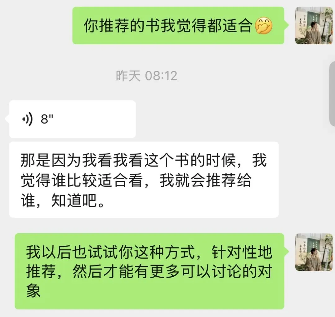 而是真诚地认为这本书适合我,能精准地说出他觉得这本书和我相契合的地方在哪里。