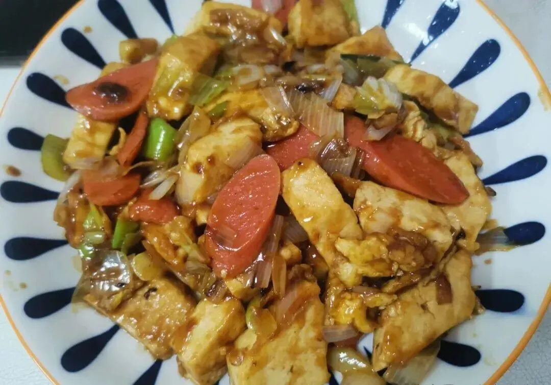这道真的零难度~豆腐切菱形块 , 打颗蛋 , 把蛋液淋到豆腐上面 , 下锅煎到两面微微发黄就先盛出来 , 然后火腿肠和大葱一块儿爆炒 , 豆腐回锅 , 浇上提前调好的料汁 , 翻匀 , 搞定!