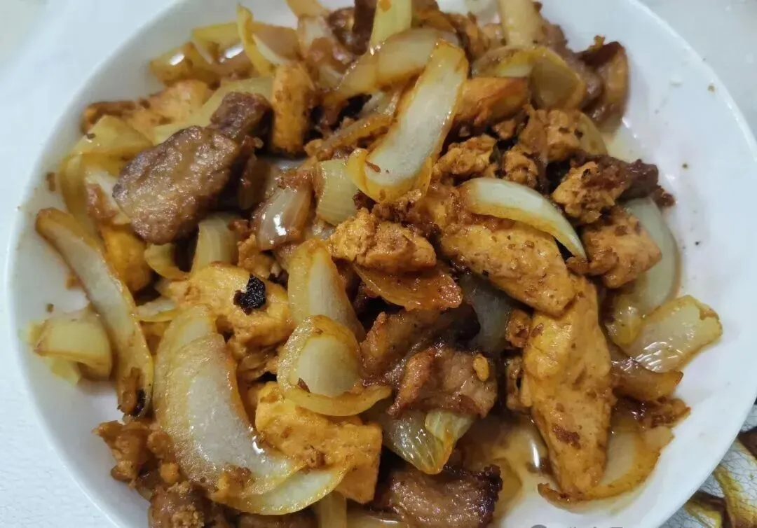 五花肉配豆腐 , 绝了 , 真的绝了!豆腐先煎金黄盛出来 , 五花肉下锅炒变色 , 淋点老抽上色 , 豆腐倒回去翻几下 , 放洋葱 , 加生抽蚝油和盐 , 炒匀 , 齐活~