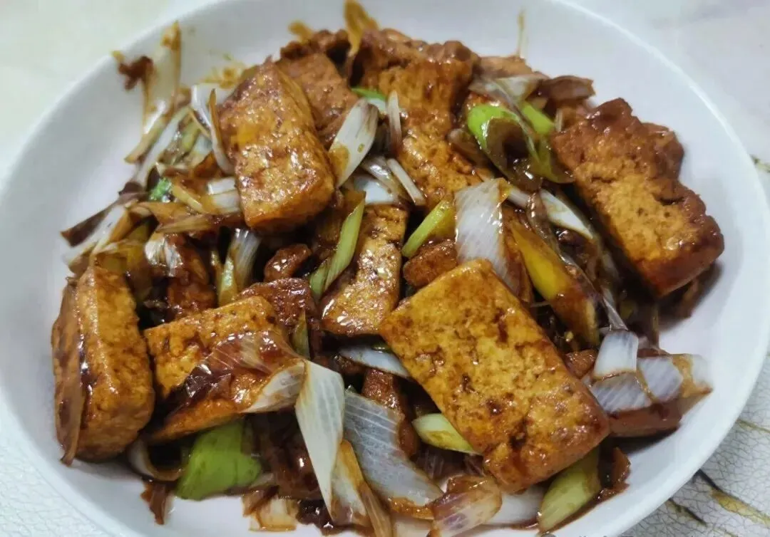就俩食材 , 大葱 , 豆腐 , 朴素到不行。 但是!全靠一碗灵魂料汁撑场面 , 一勺生抽 , 半勺老抽 , 一勺蚝油 , 半勺白砂糖 , 一勺淀粉 , 加半碗水搅匀 , 豆腐煎好放大葱 , 浇上去咕嘟两分钟 , 就这么简单。